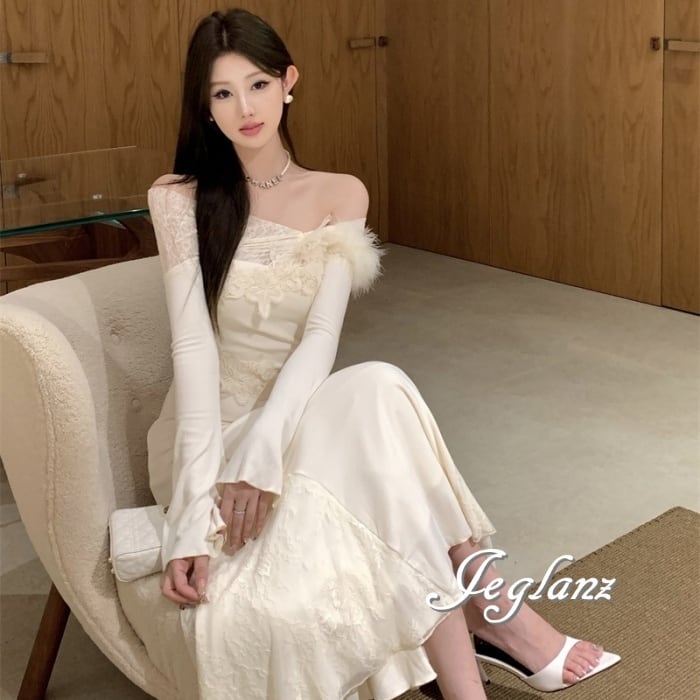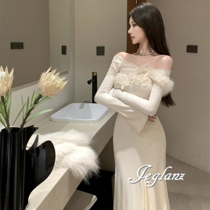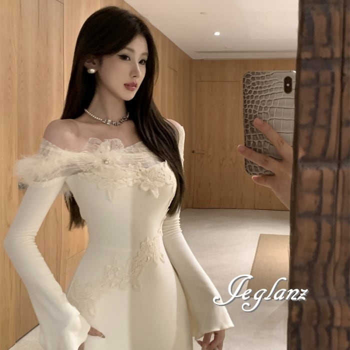 レース 刺繍 ワンピース オフショル フェザードレス 透け感(M9172)ζ