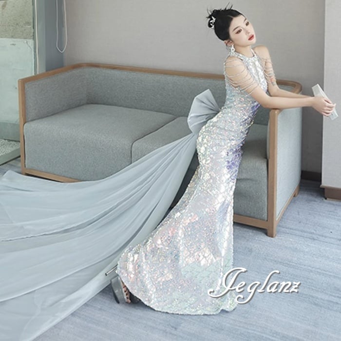 2色 パーティ イブニングドレス ビックボウ パール 光沢 バックシャン(M9186)ζ