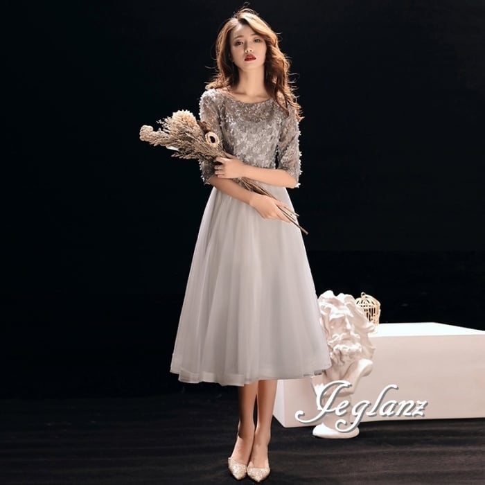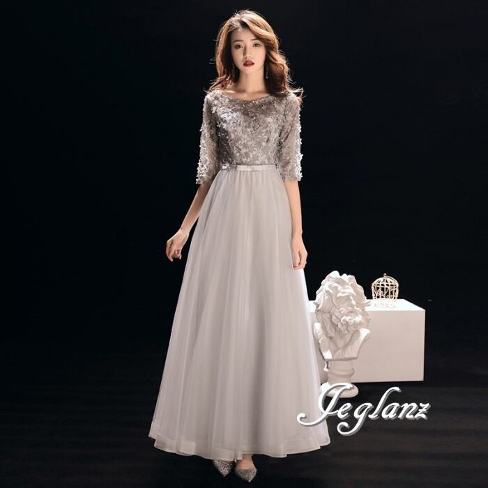 2色 パーティ イブニングドレス 花モチーフ 編み上げ 7分袖 2パターン(M9192)ζ