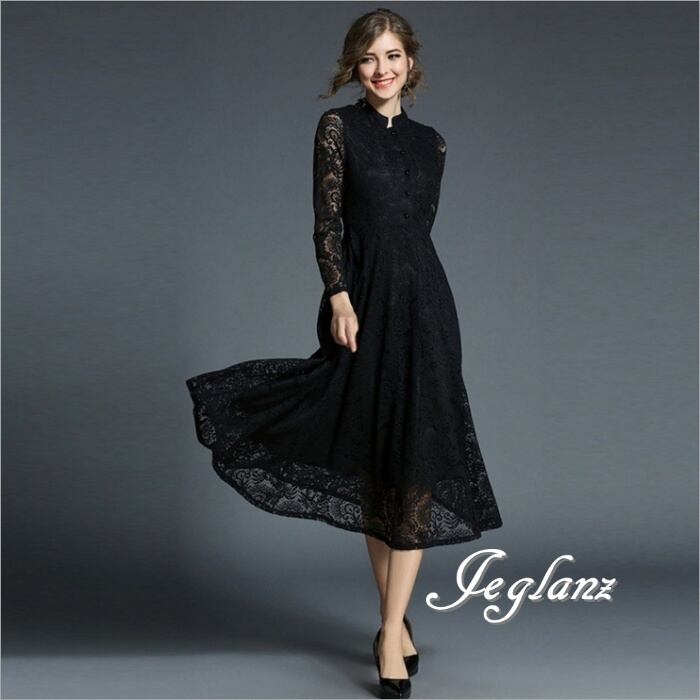 総レース ワンピース ドレス 立ち襟 シアー エターナル 2色(M9223)ζ