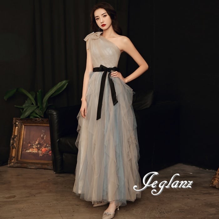 3色 イブニングドレス ワンショル レイヤード チュール 肩リボン(M9230)ε