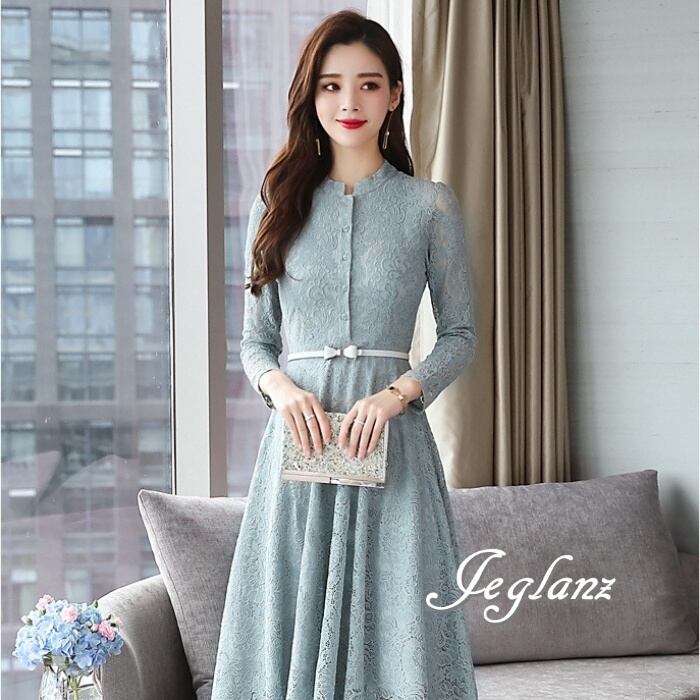2色 結婚式 パーティ ドレス ワンピース 総レース シアー 7分袖 ファンシー(M9248)ζ