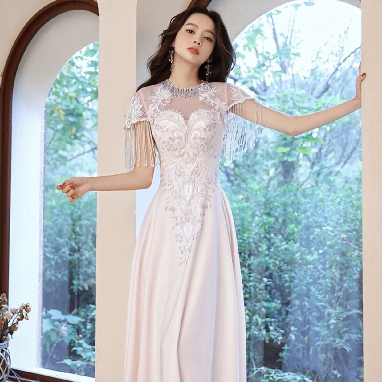 パーティ ドレス フリンジ 刺繍 レース 透け感 ロング/イブニング(M9289)ε