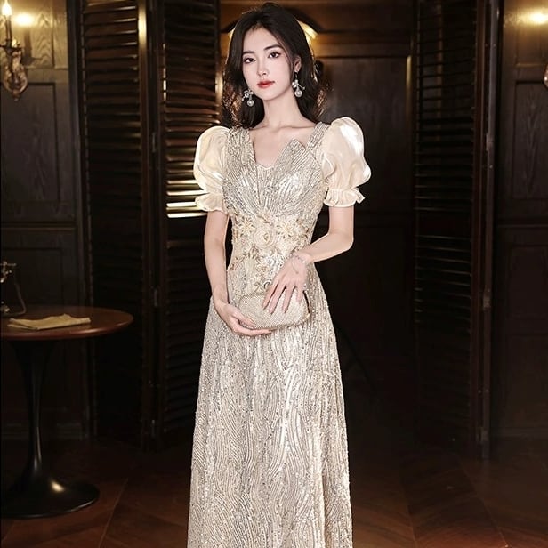 華やか パーティ イブニングドレス スパンコール 光沢感(M9377)ζ