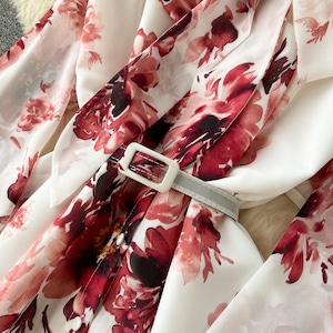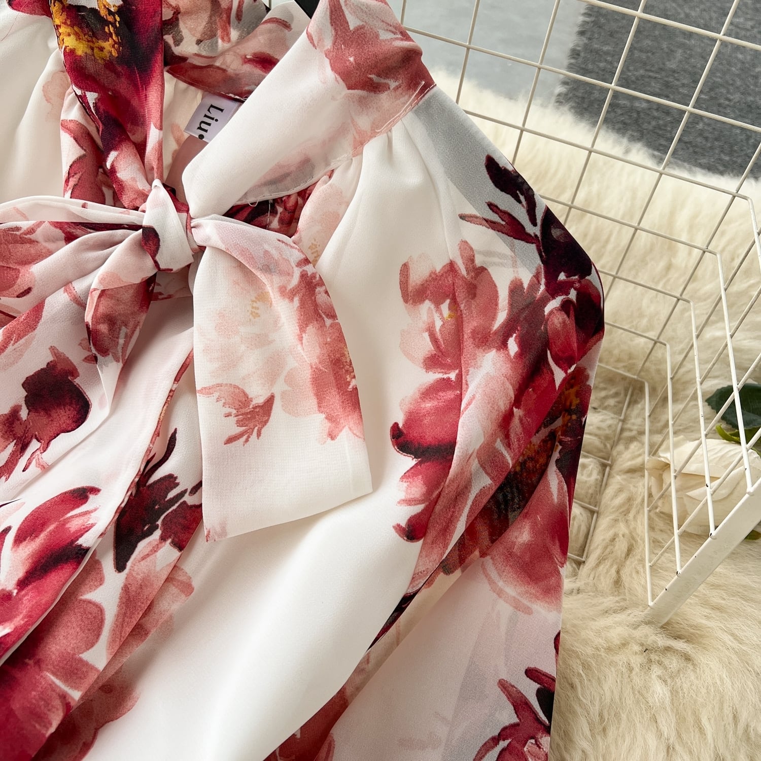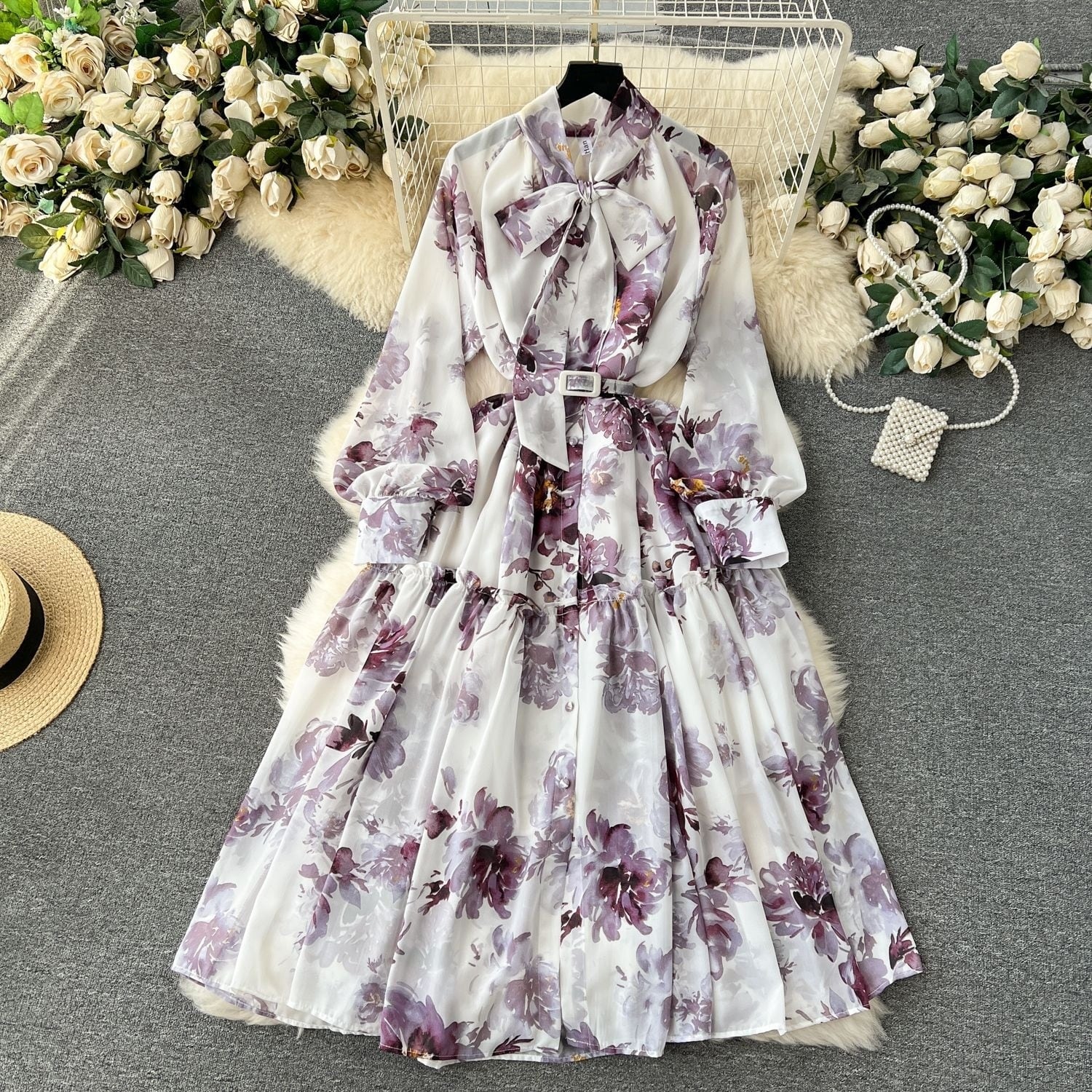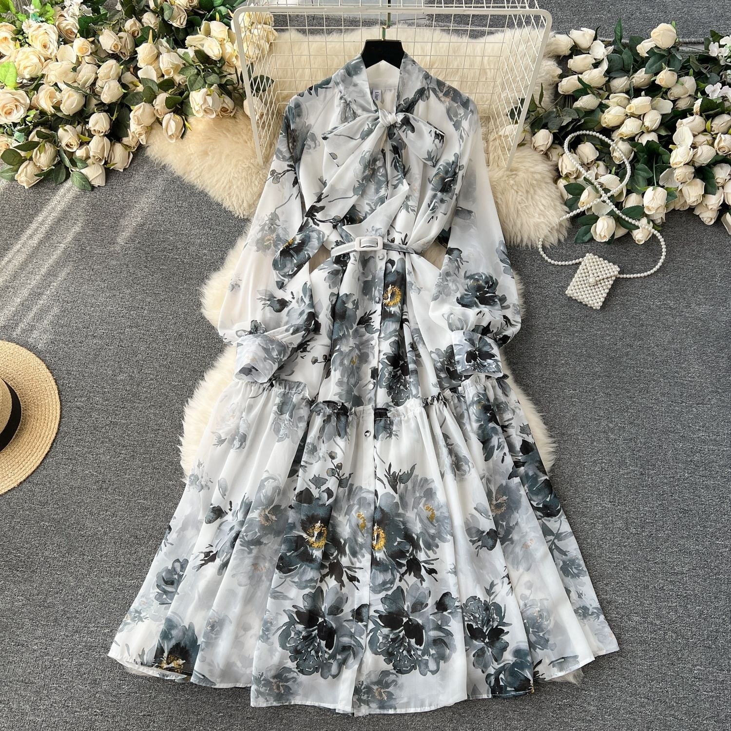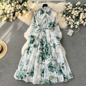 水彩タッチの花柄がアンティーク感を醸し出すボウタイワンピース