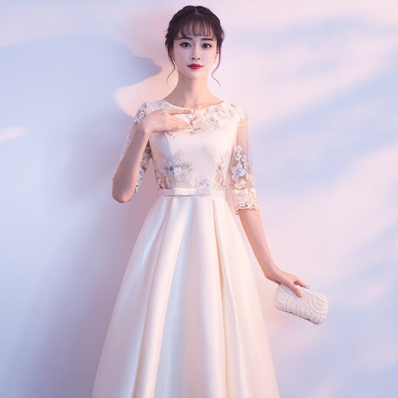 2色 パーティ ドレス ワンピース 刺繍 レース 透け感 7分袖 上品(M9448)ζ