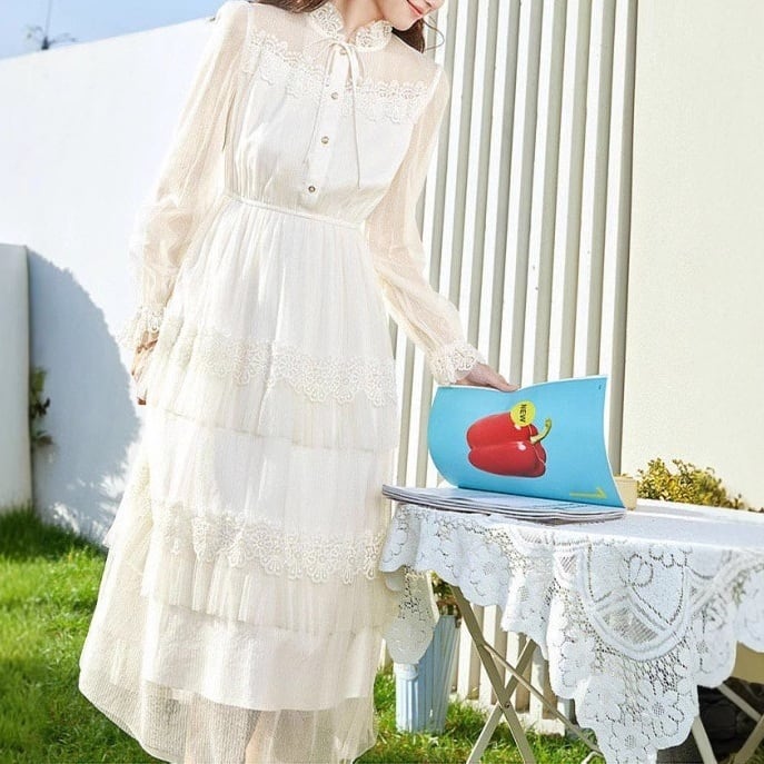 透かしレースに優美な刺繍をあしらったワンピースドレス