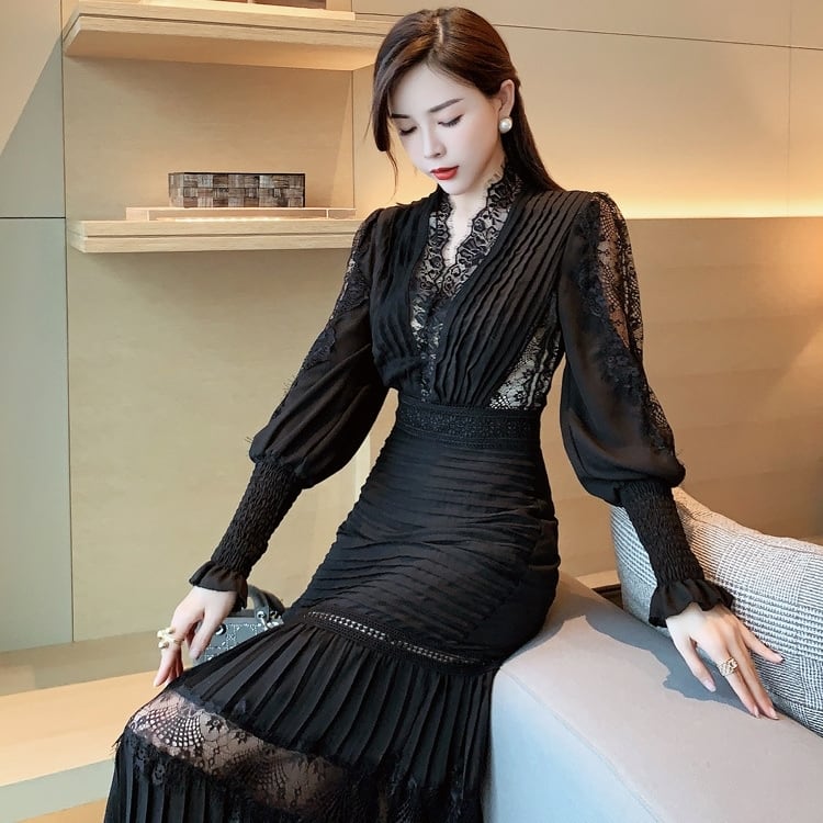 2色 ワンピース ドレス Vネック プリーツ 異素材 レース シアー感 ♪(M9539)★ ζ