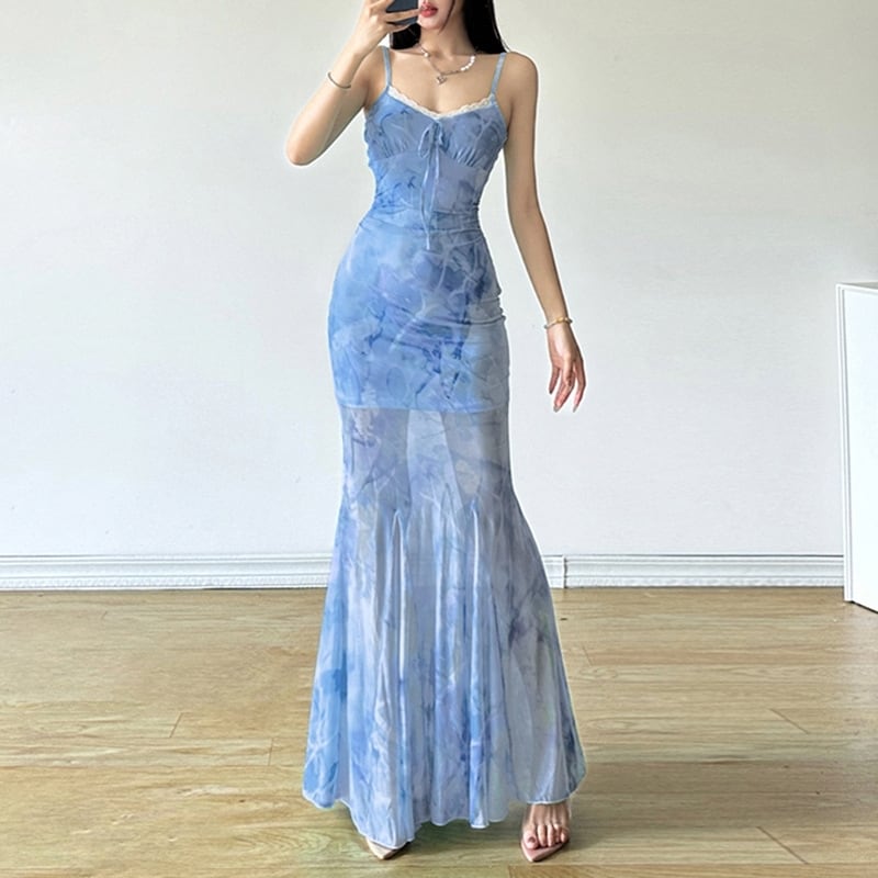 3色 パーティ ドレス マキシ キャミワンピース タイダイ柄 透け感(M9648)ζ