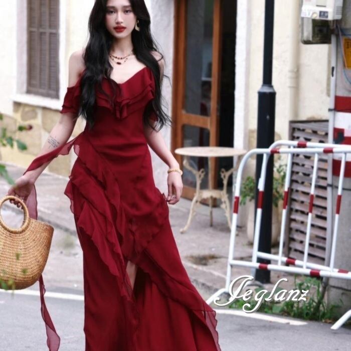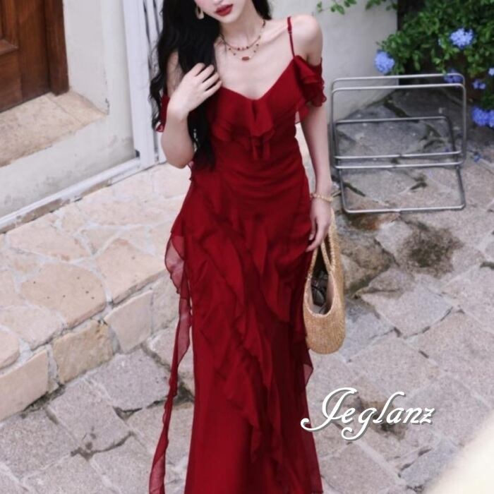 マキシ丈 キャミ ワンピース スリット入り レイヤード フリルカラー 背中見せ(M9999)ε