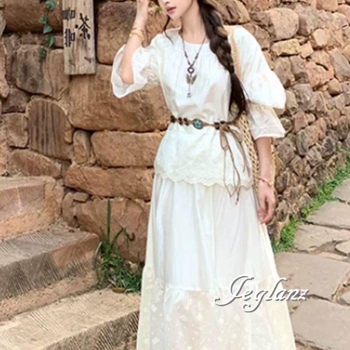 セットアップ 2点 刺繍 レース ブラウス マキシ スカート 着回し ( MA224)ικ