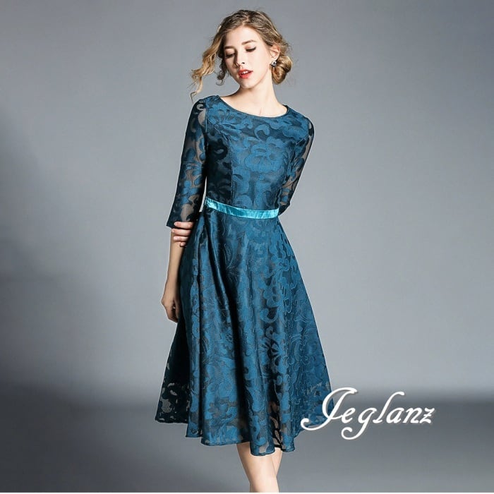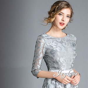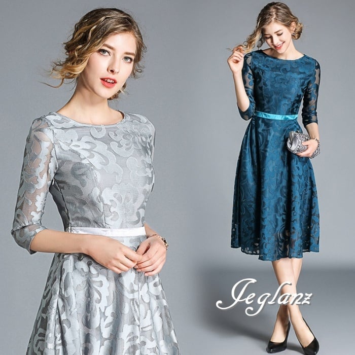 3色 パーティ ドレス ワンピース モチーフ シアー感 ひざ丈 7分袖(MA372)ζ