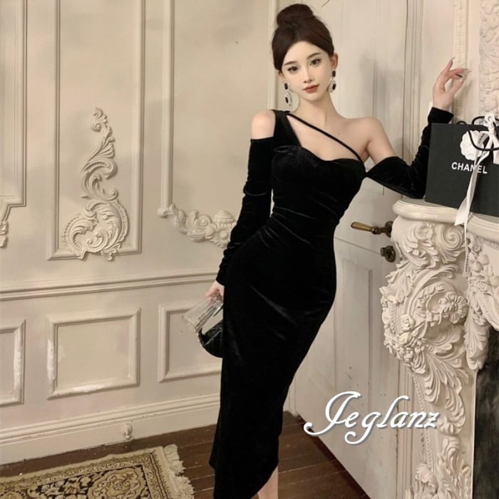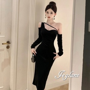 パーティドレス ワンショル ワンピース ベルベット調 肌見せ ♪ (MA411)ζ