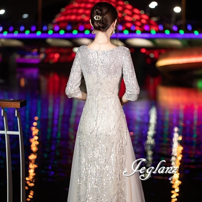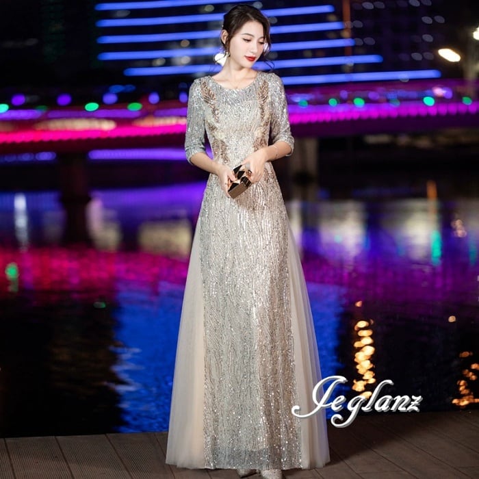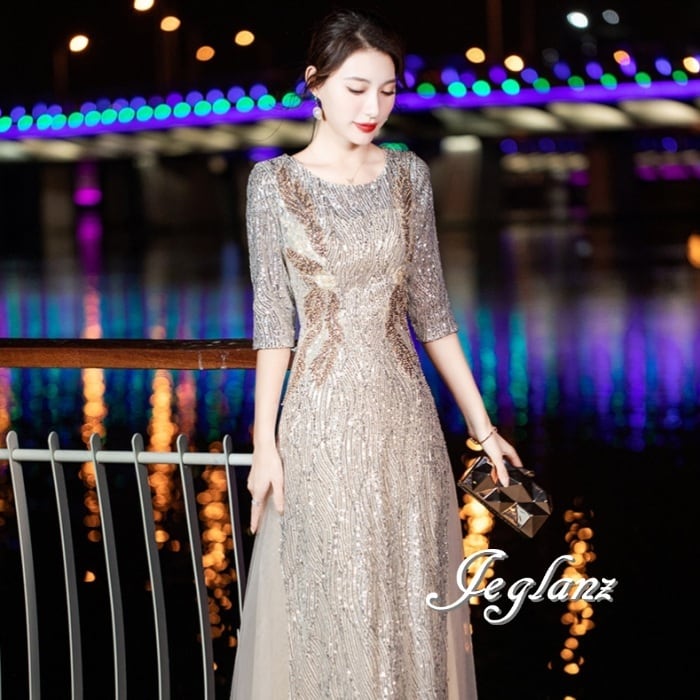 パーティドレス イブニングドレス 異素材 チュール 光沢感 7分袖(MA412)ζ
