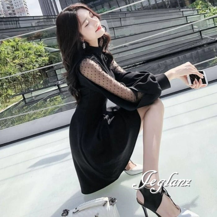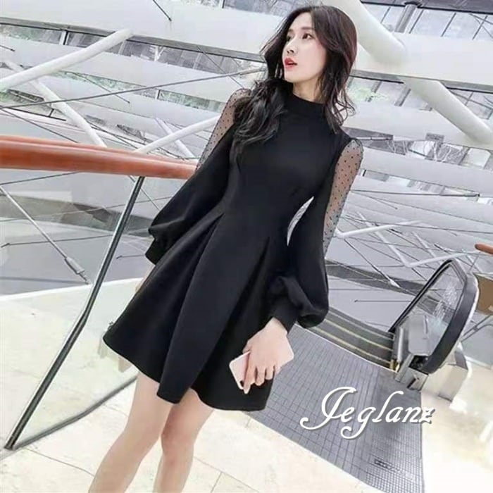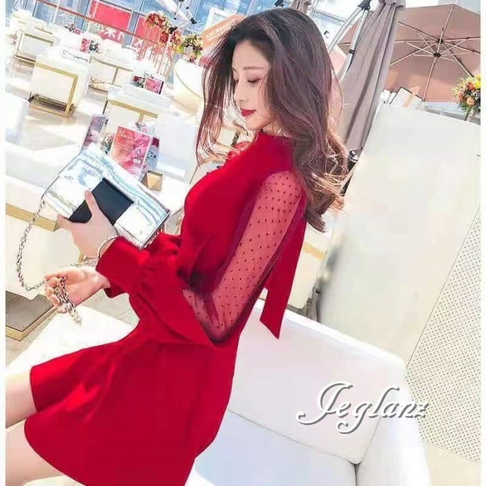 3色 パーティ ドレス ワンピース 異素材 レース 水玉 背中リボン (MA415)ζ