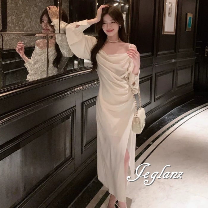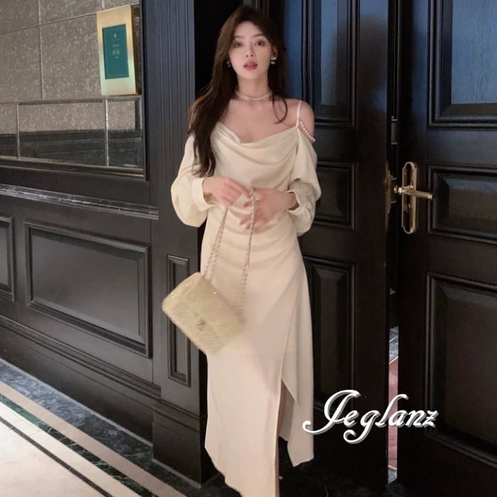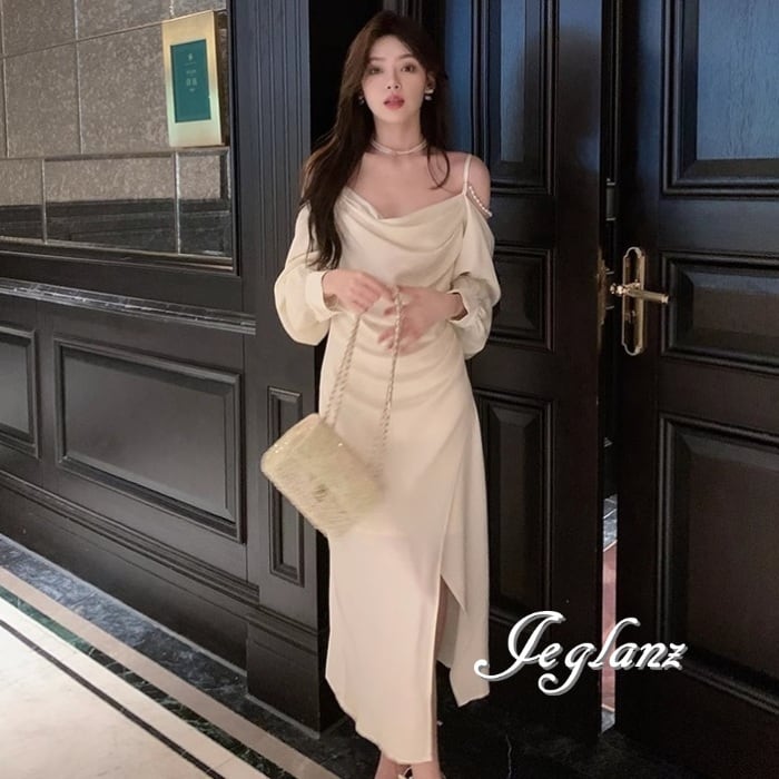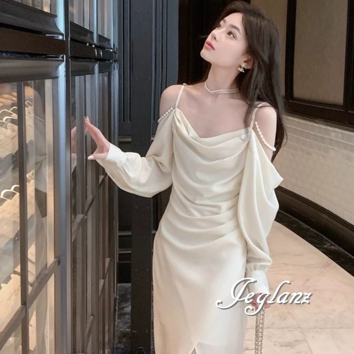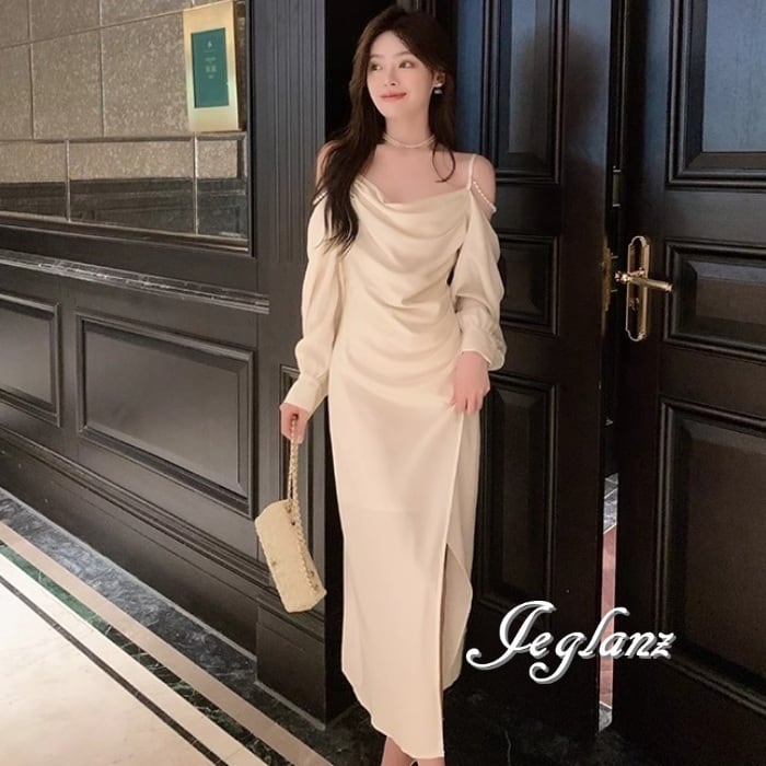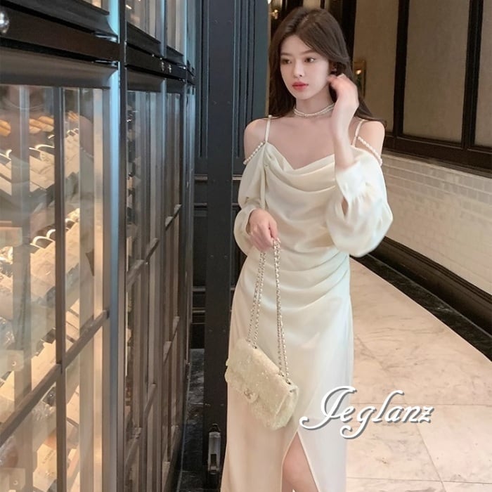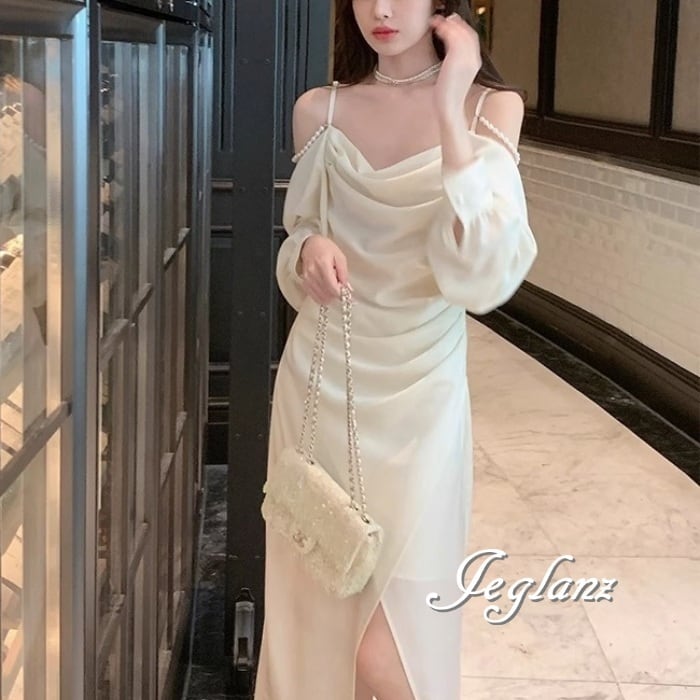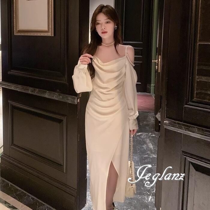 パーティ ワンピース ドレス パール ギャザー スリット入り(MA633)ζ