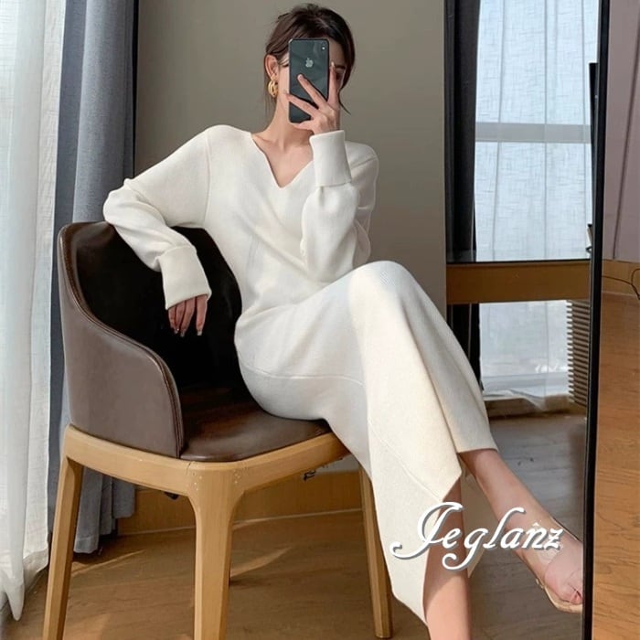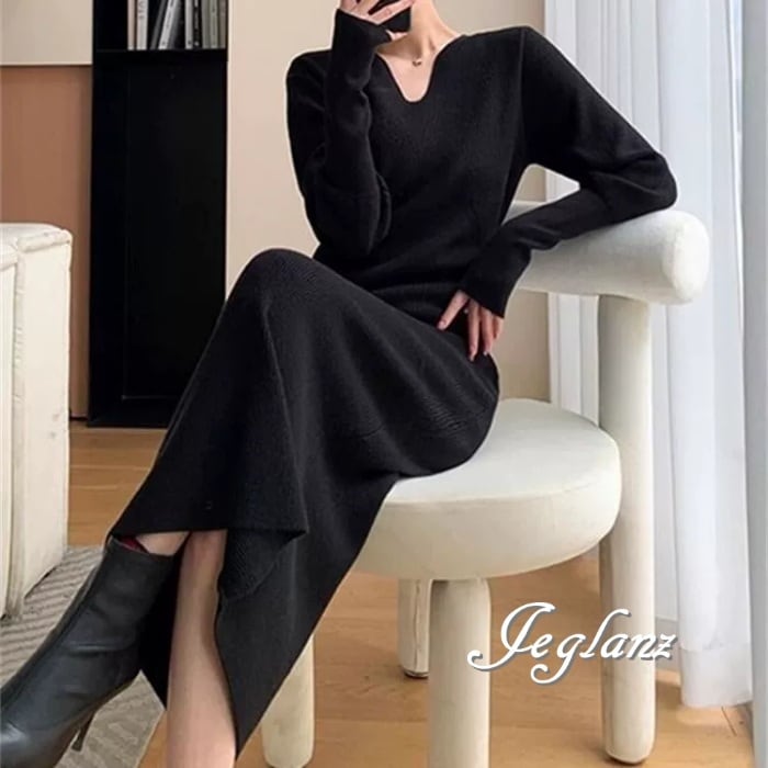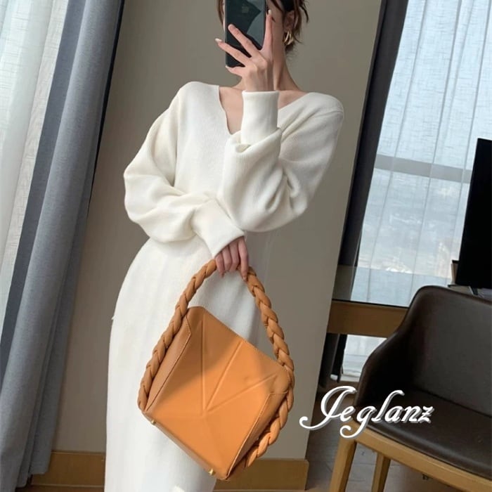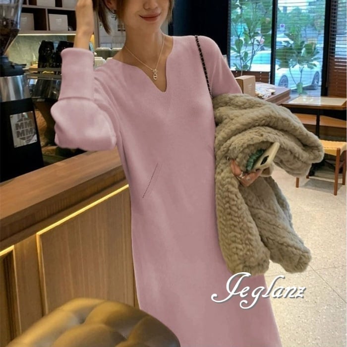 4色 ニット ワンピース サック Vネック きれいめ シンプル派(MA655)γ
