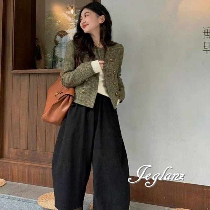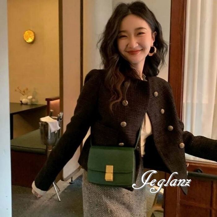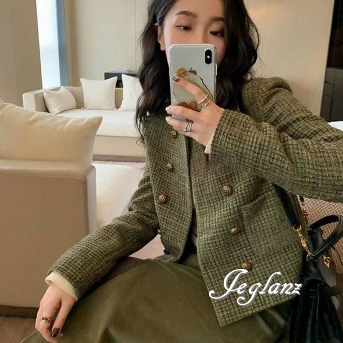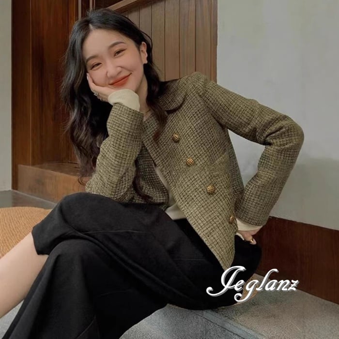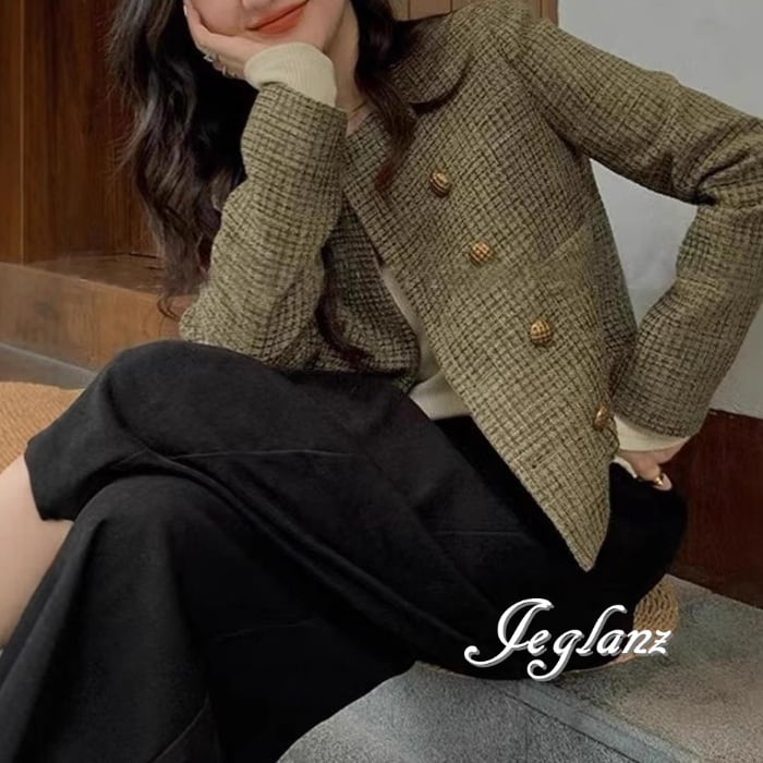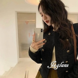 チェック ツイード ニット ジャケット ダブルブレスト レトロ感(MA663)τ