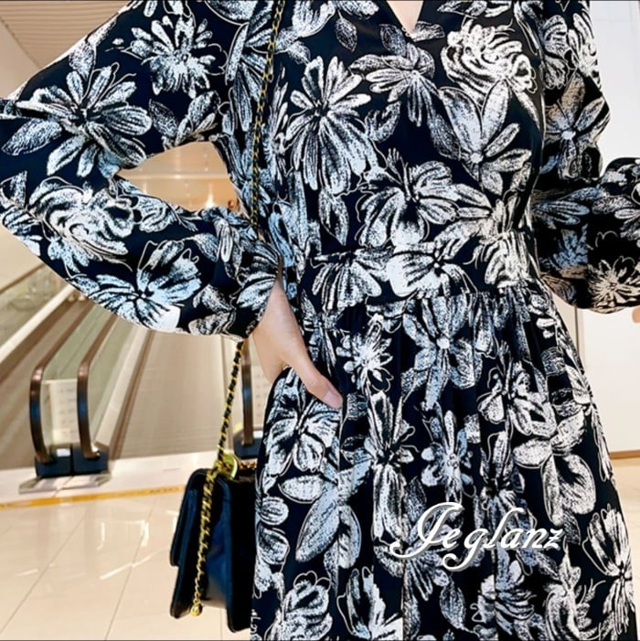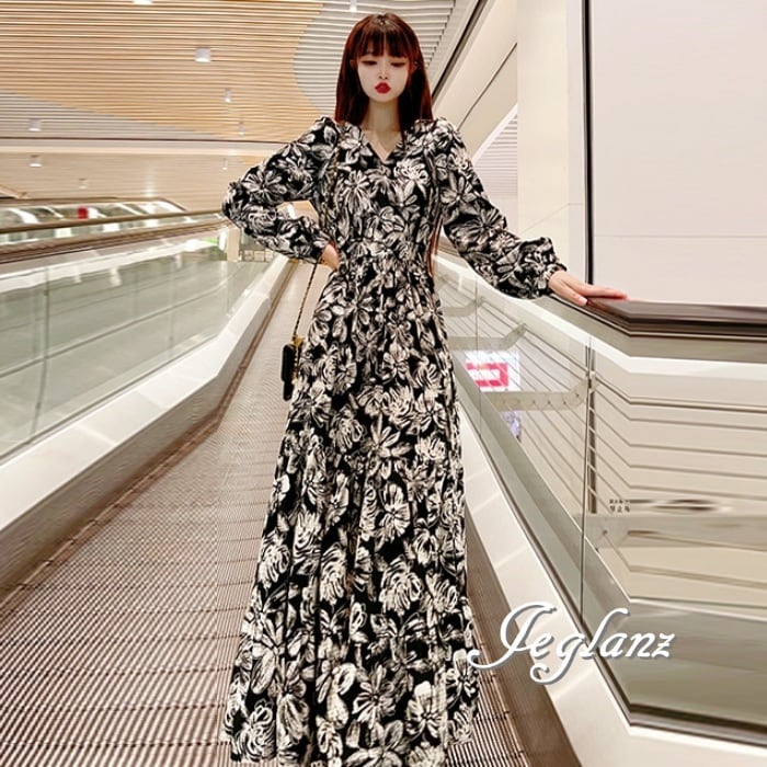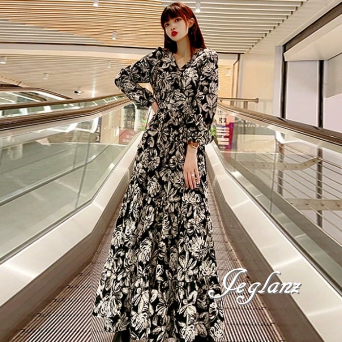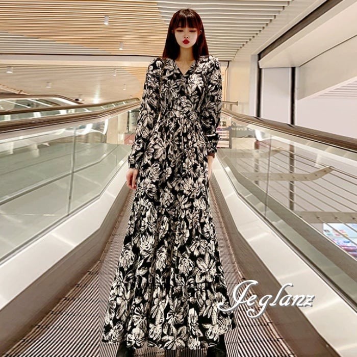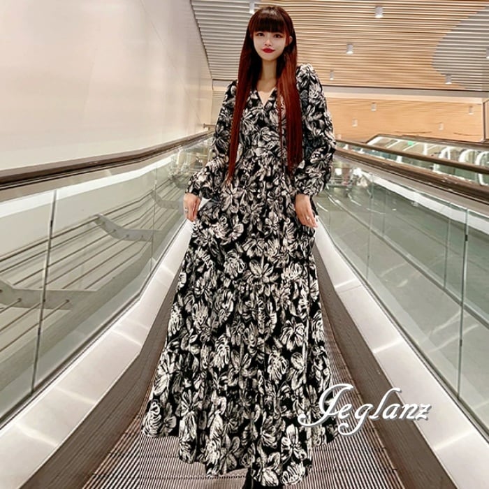 マキシ 花柄 プリント ワンピース Aライン モノトーン ♪ (MA681)γ