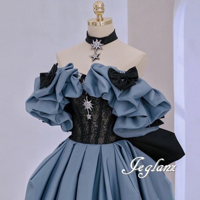 2色 イブニングドレス オフショル 配色 フリル リボン 編み上げ(MA714)ε