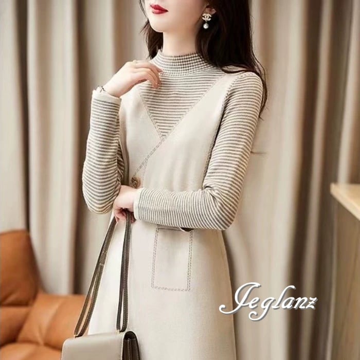 フェイク ニット バイカラー ワンピース ハイネック ボタン (MA723)γ