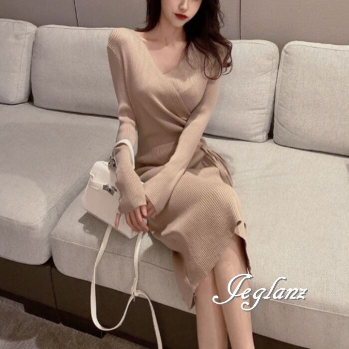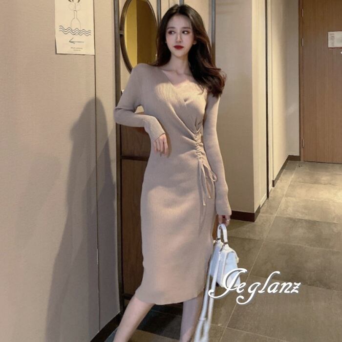 2色 ギャザー ワンピース 長袖 スリット入 きれいめ シンプル派(MA731)γ