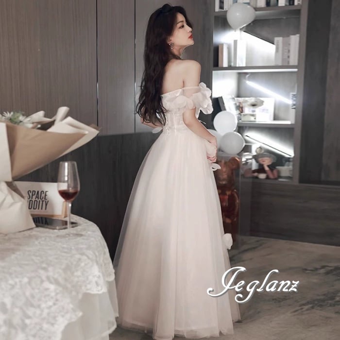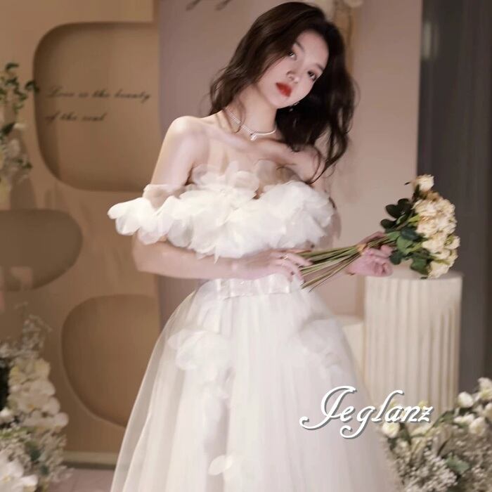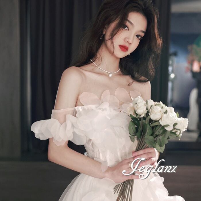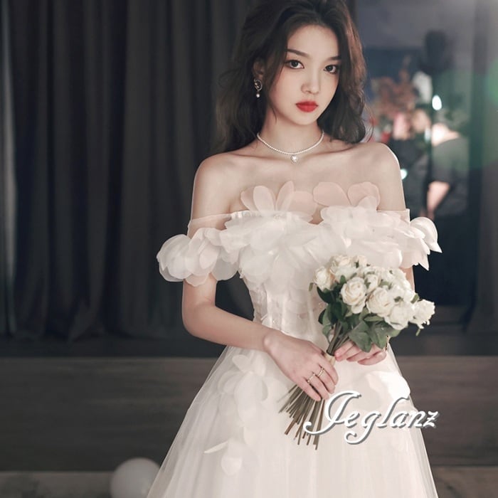 優雅 ウエディングドレス オフショル チュール 立体フラワー ♪(MA773)ο