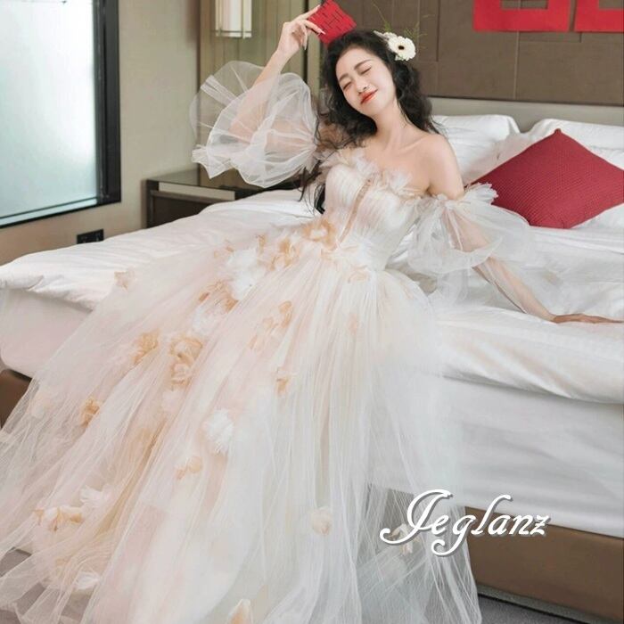 ウエディングドレス ベアトップ チュール 立体フラワー つけ袖(MA774)ο