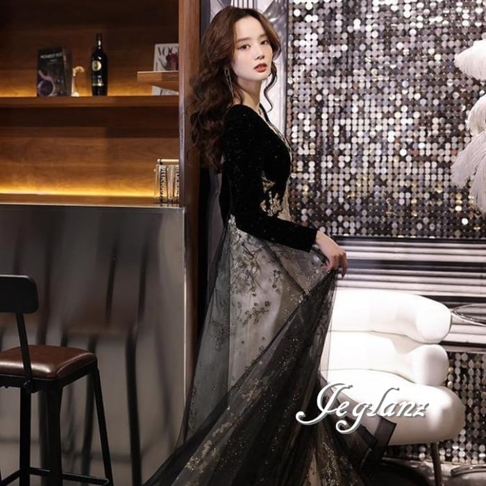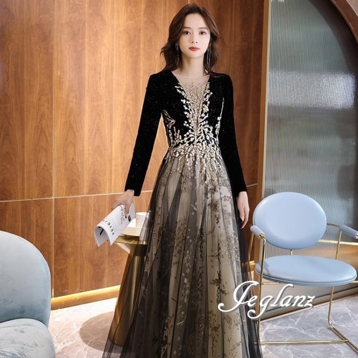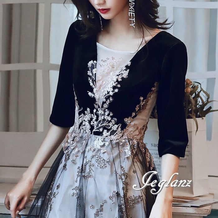 優雅 イブニングドレス ベルベット調 ビジュー 編み上げ 光沢感 (MA781)η