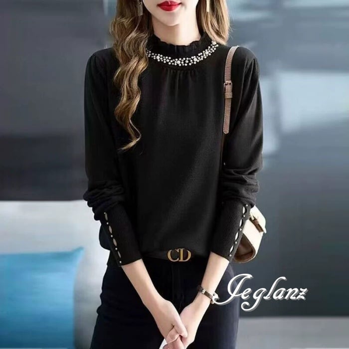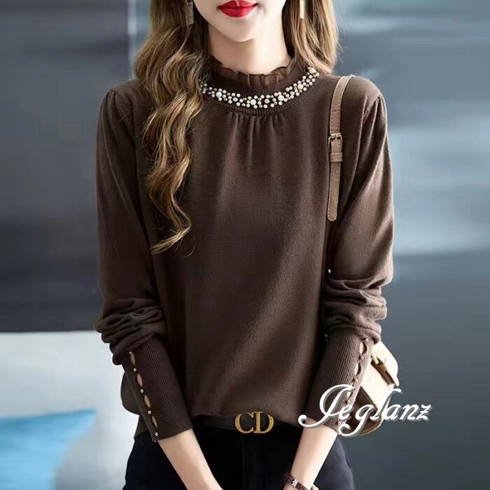 2色 ビジュー付き ニット カットソー 立ち襟 袖ボタン きれいめ(MA803)σ,ς*