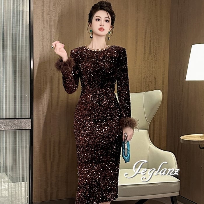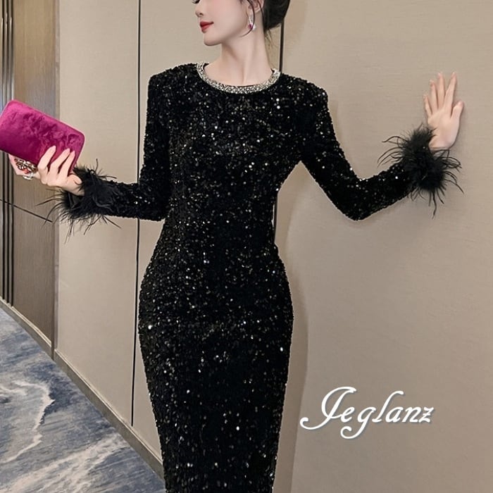 パーティ ドレス ワンピース ビジュー フェザー 光沢感 2色(MA825)η