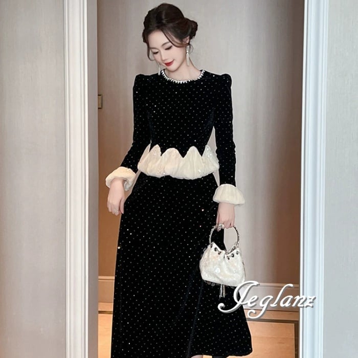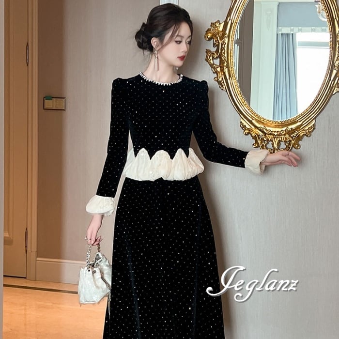 バイカラー ワンピース パール付き シャイニー キラキラ 光沢感(MA835)ζ