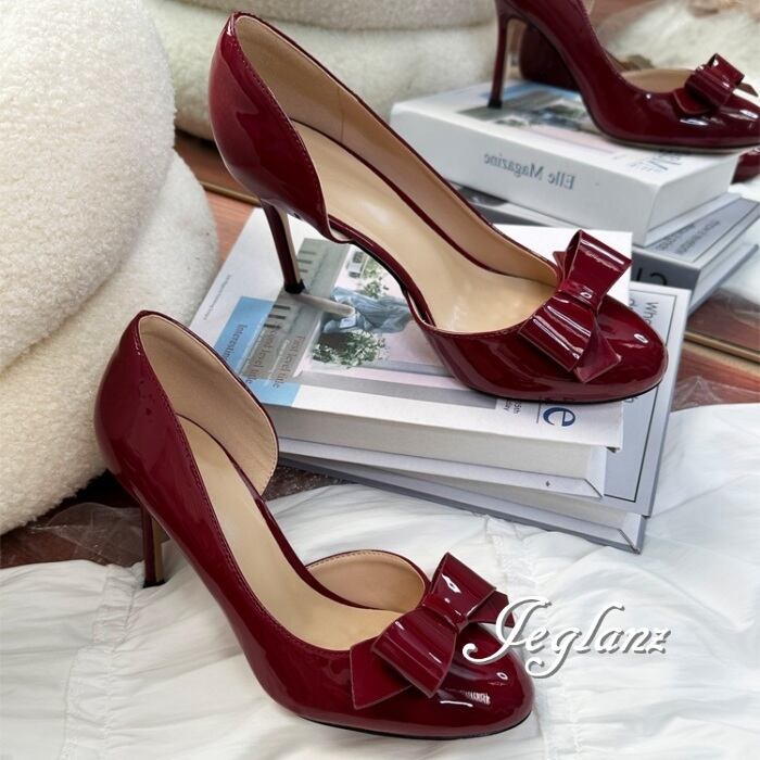 4色 パーティ パンプス ハイヒール リボン エナメル 光沢 6cm/8cm (MA854)χ