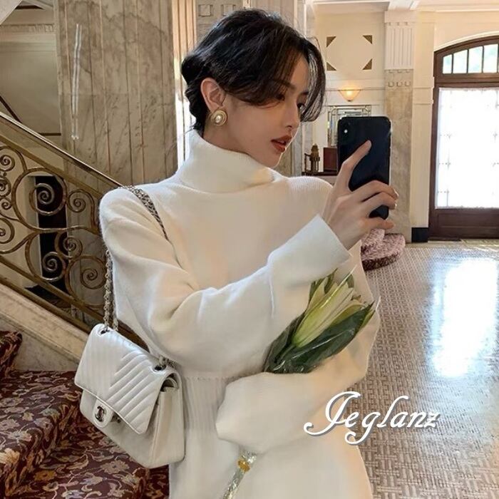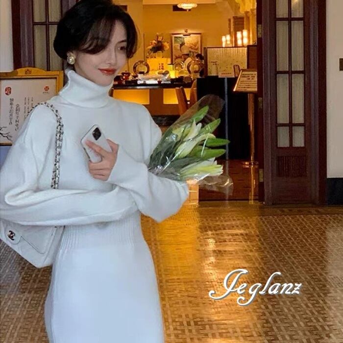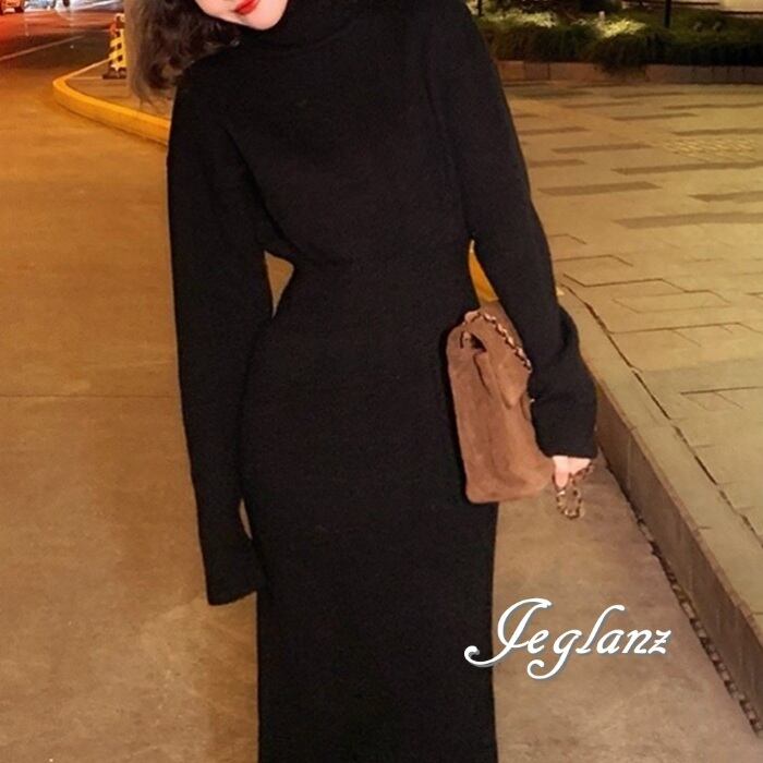 3色 ニット ワンピース タートルネック ドロップショルダー(MA871)γ