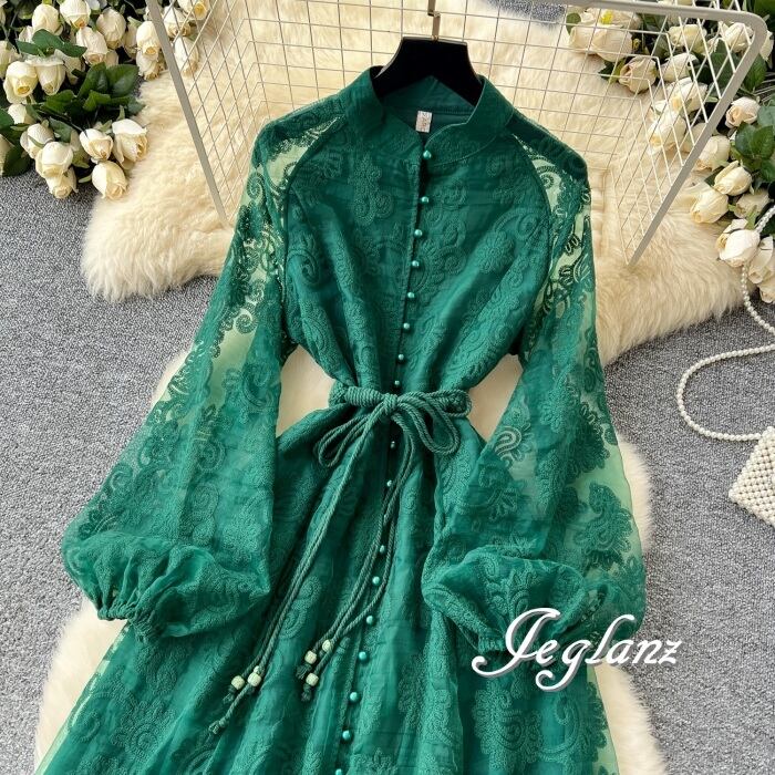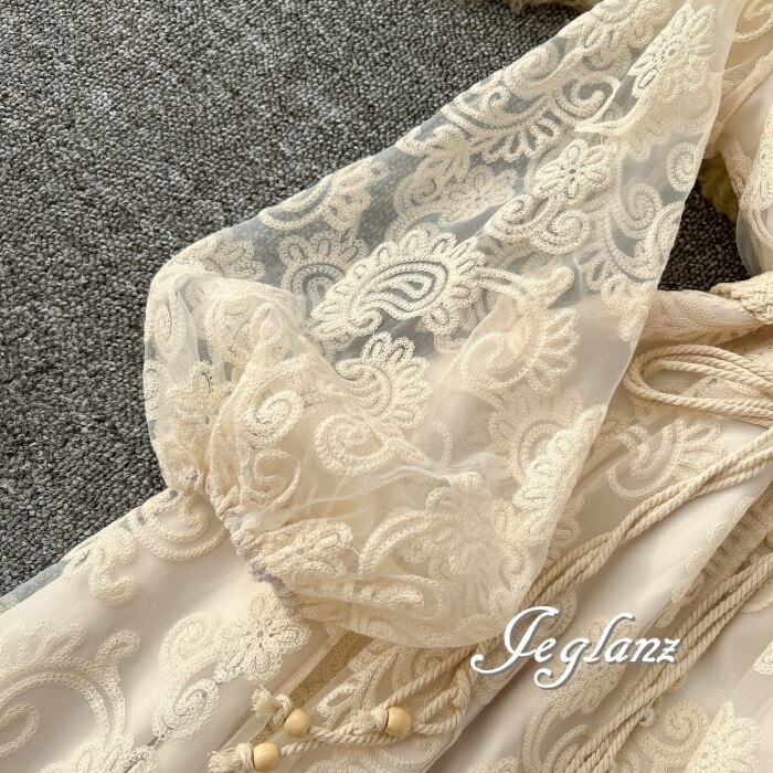 2色 ワンピース ボリューム袖 ドレス 刺繍 レース 紐ベルト エレ派(MA883)ζ
