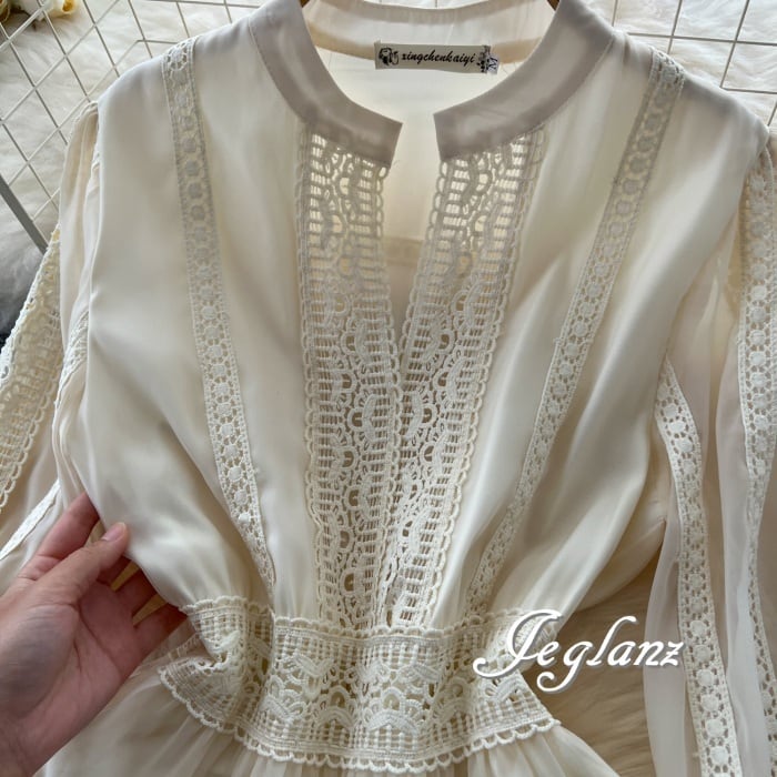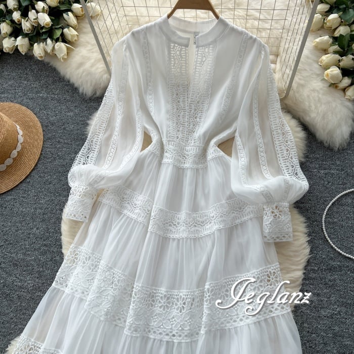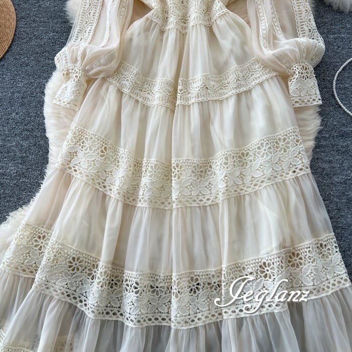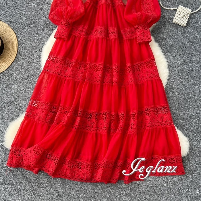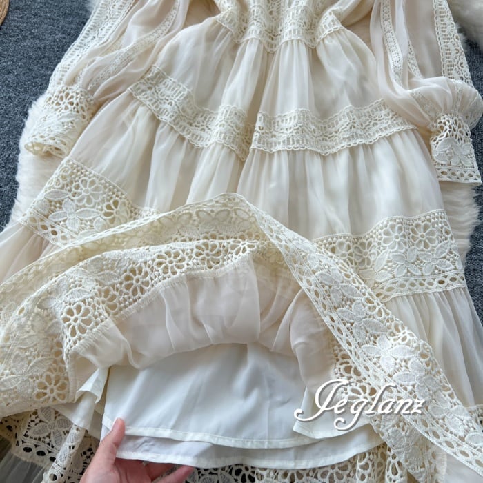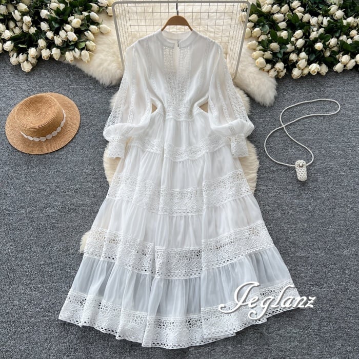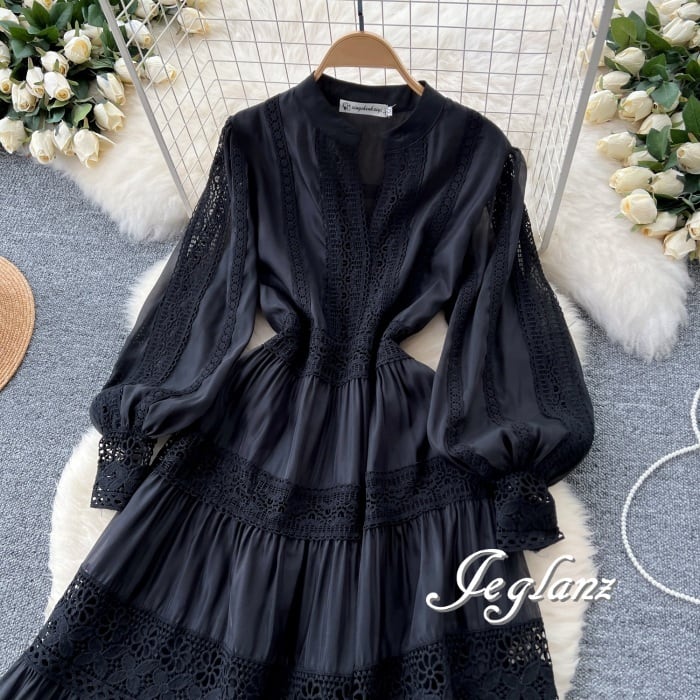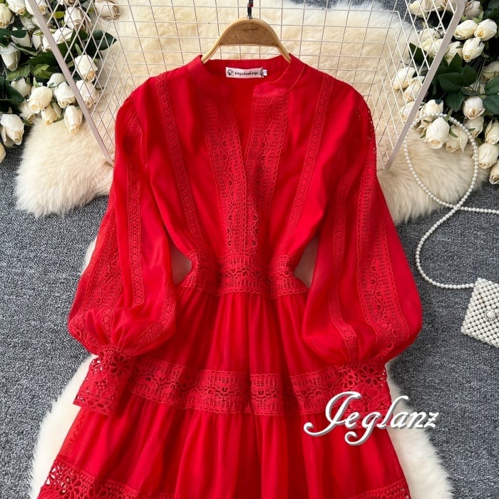5色 レース 刺繍 ティアード ワンピース ドレス キーネック(MA884)α