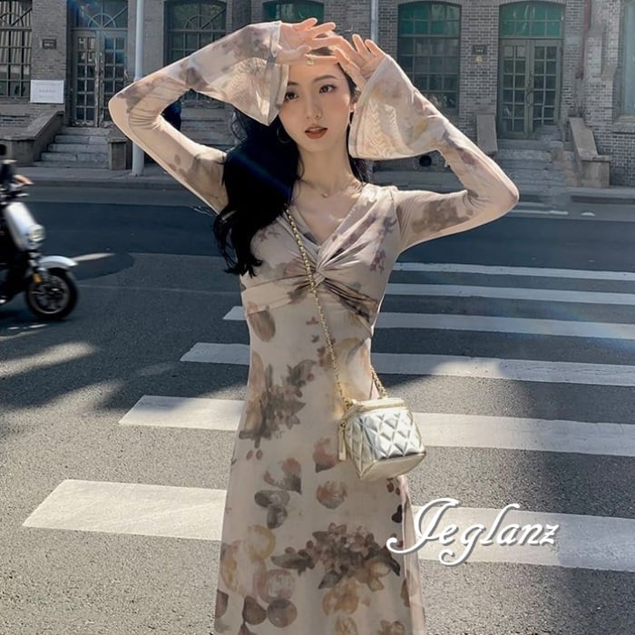 プリント ワンピース ドレス ツイスト Vネック きれいめ (MA895)γα