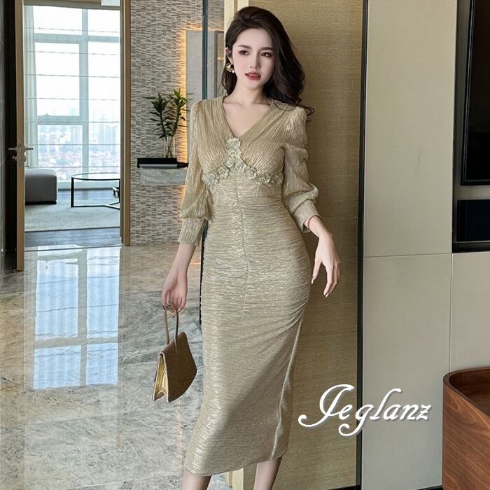 パーティ ドレス プリーツ 立体フラワー スリット タイト 7分袖(MA923)ζ