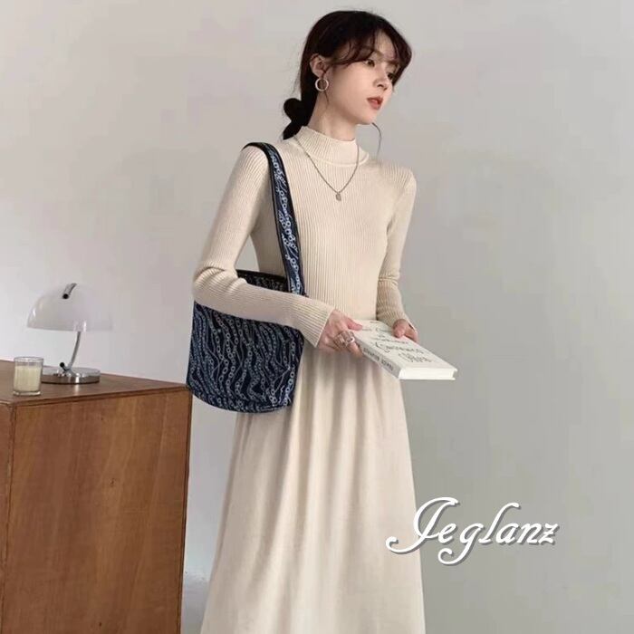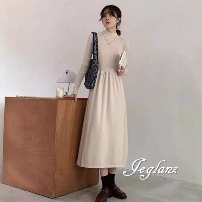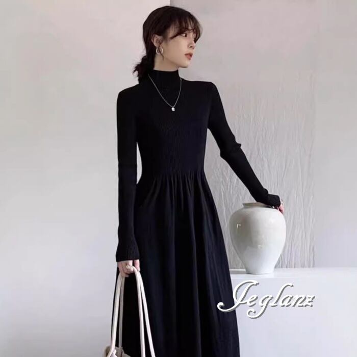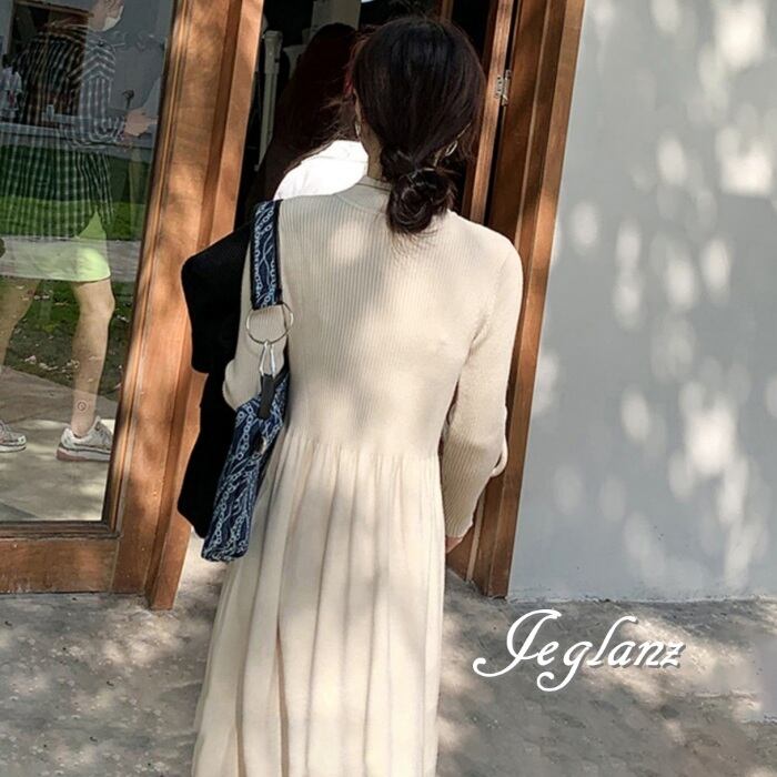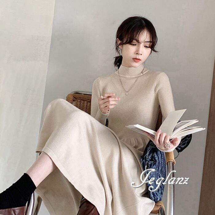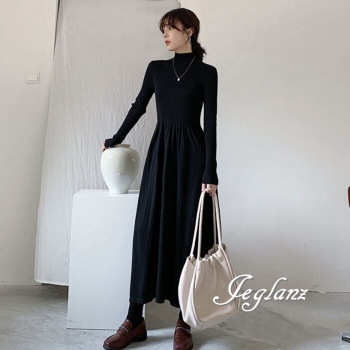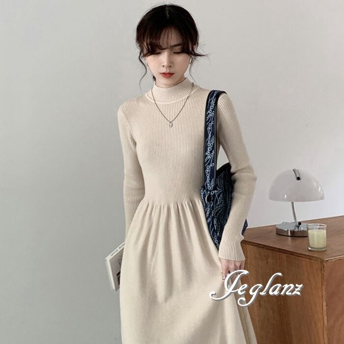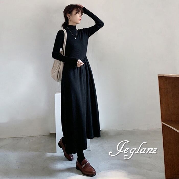 2色 ニット ワンピース モックネック Aライン シンプル 上品 (MA925)γ