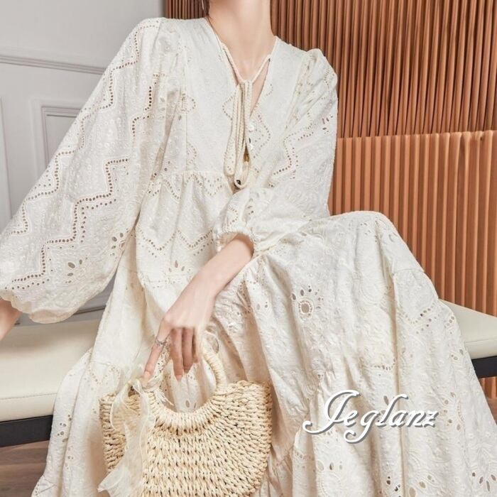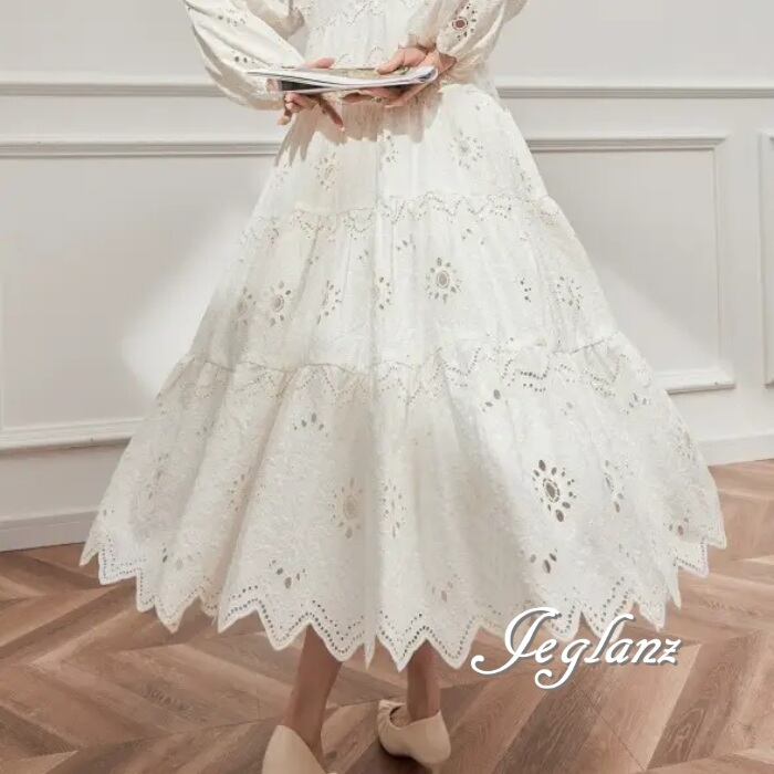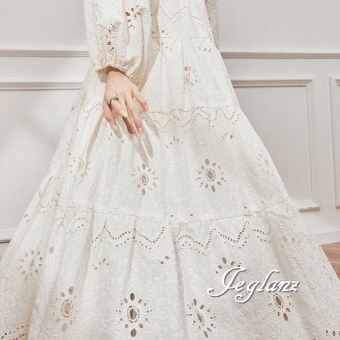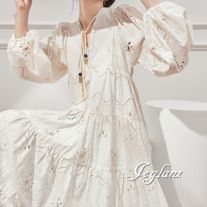 刺繍 レース ティアード ワンピース スカラップ ルーズ 7分袖 (MA929)α