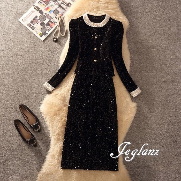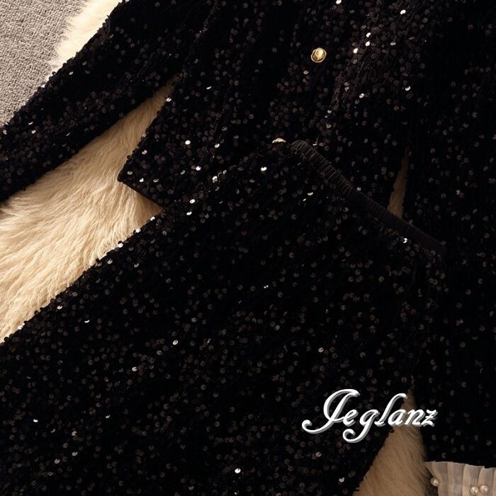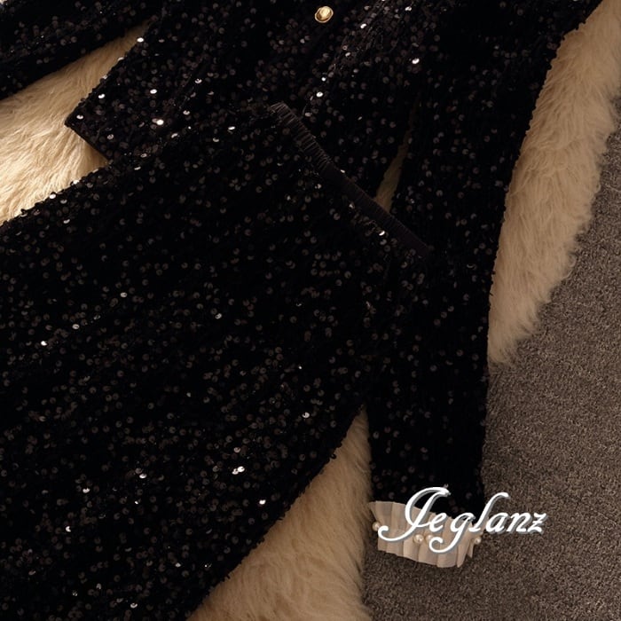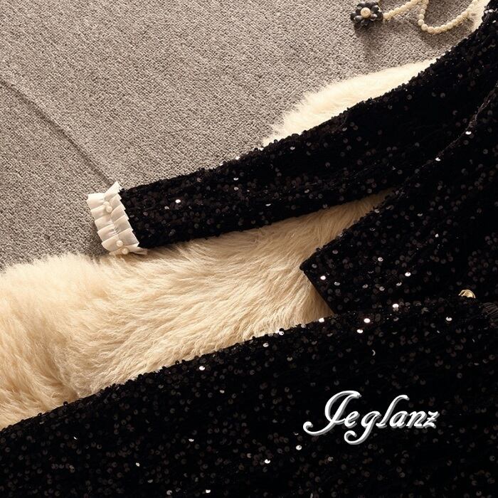 どの角度から見ても華やぎを感じるスパンコールのセットスーツ