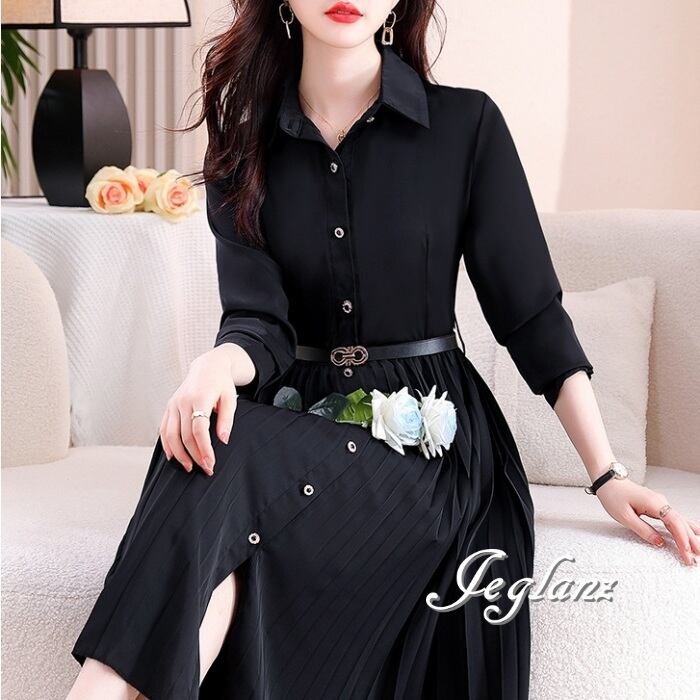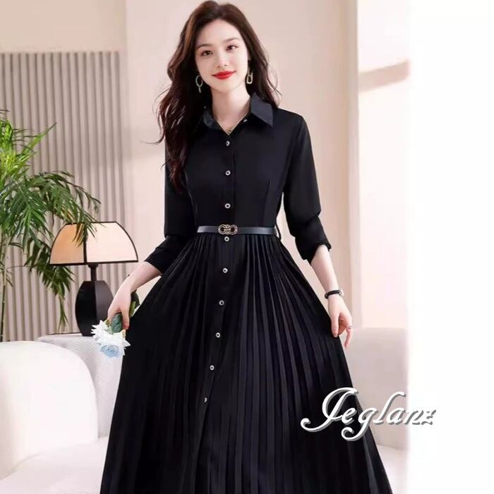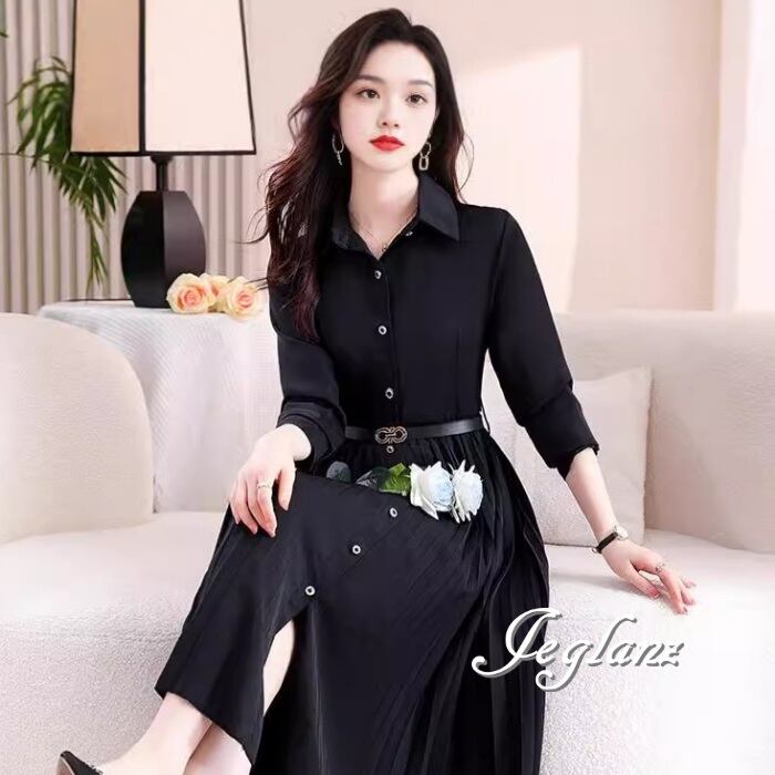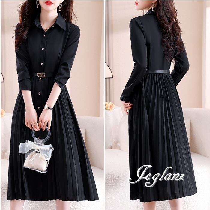 シャツ ワンピース 長袖 ドレス プリーツ ブラックドレス 韓国(MA933)ζ