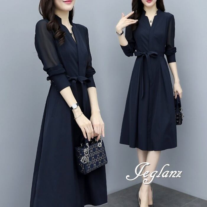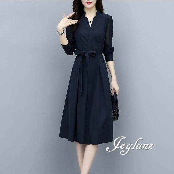 ワンピース 長袖 ドレス フォーマル 共ベルト きれいめ シンプル(MA941)γ