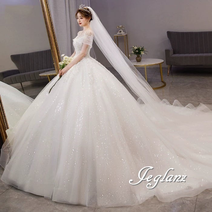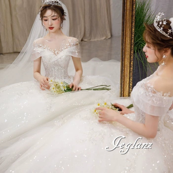 優雅 ウエディングドレス オフショル パール ビジュー 編み上げ(MA963)ο