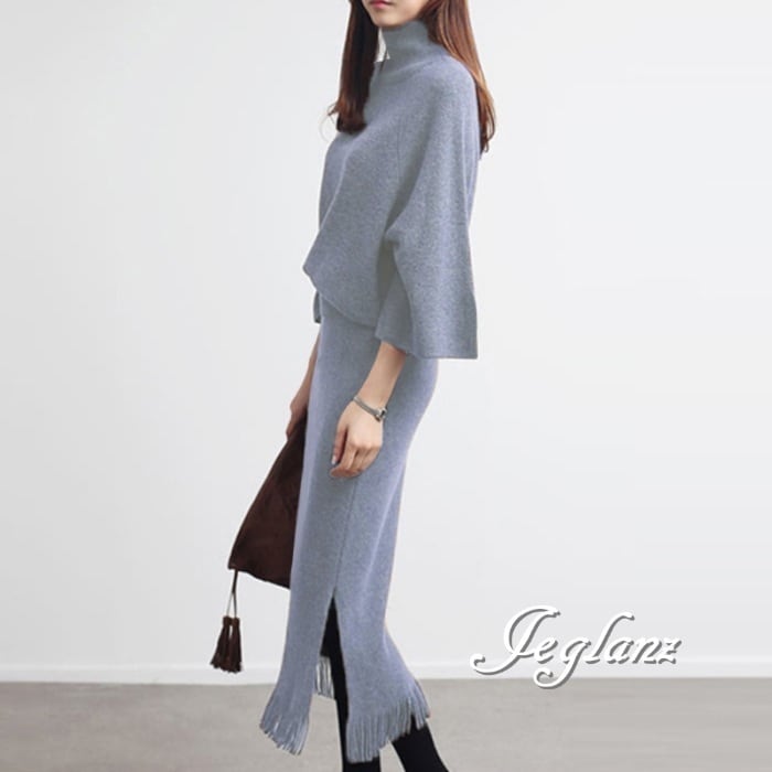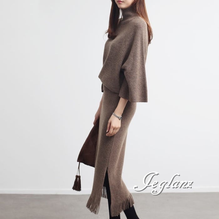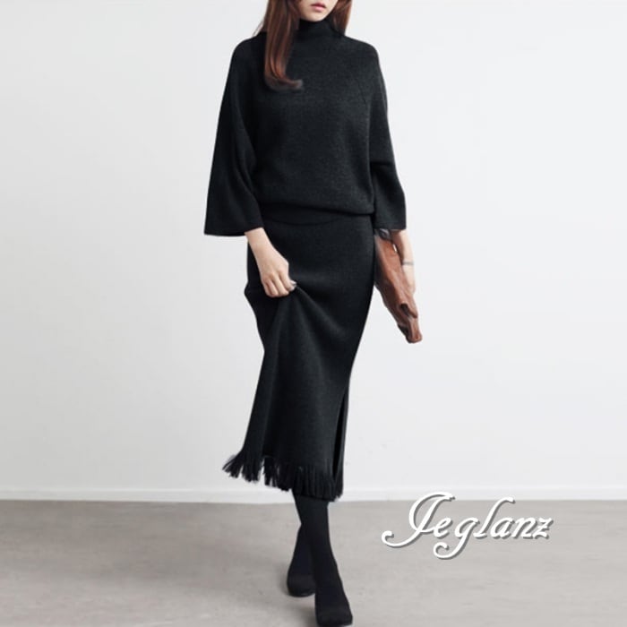 4色 セットアップ 2点 ニット ハイネック フリンジ スカート ♪(MB002)λ