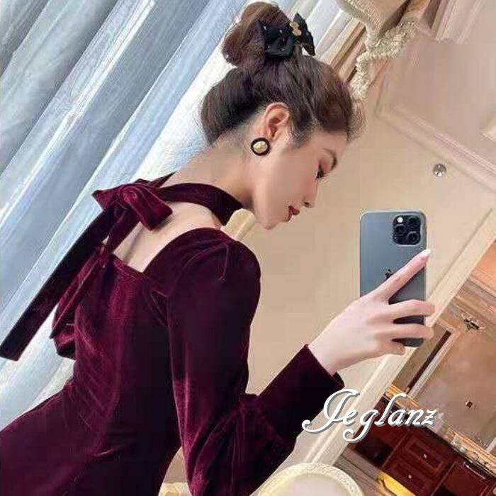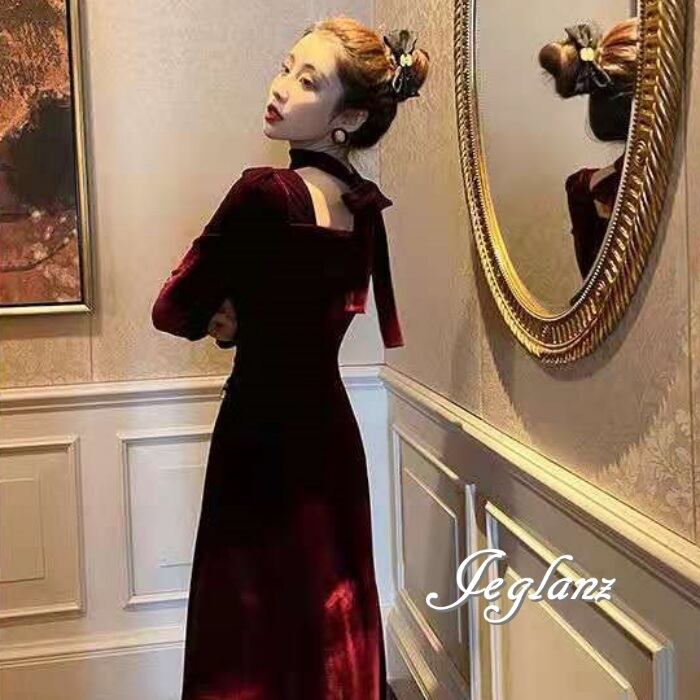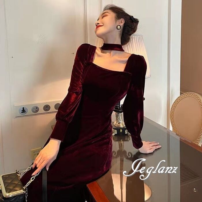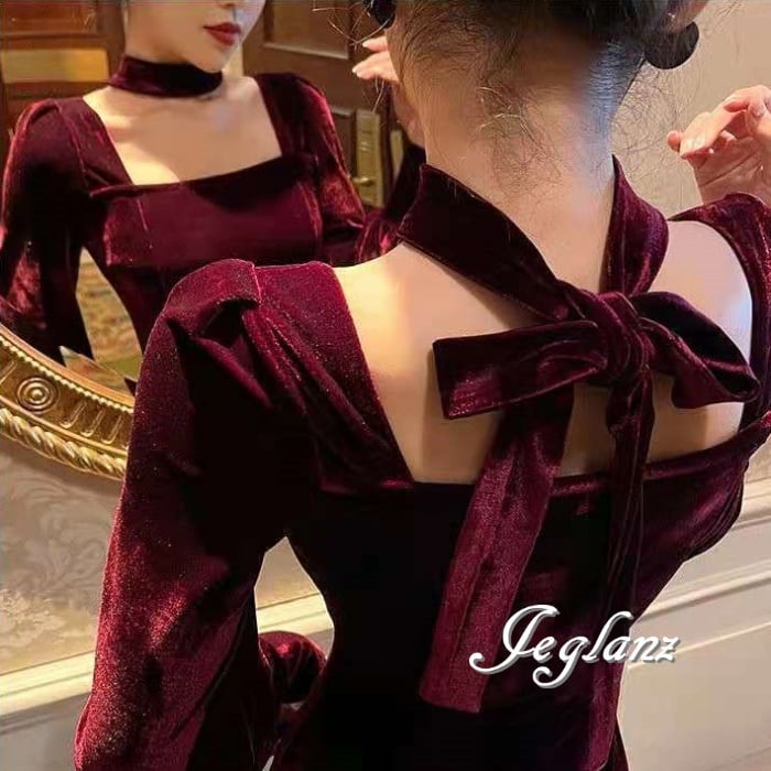 2色 ベルベット調 ワンピース ドレス タイ リボン付き クラシカル 上品(MB043)η