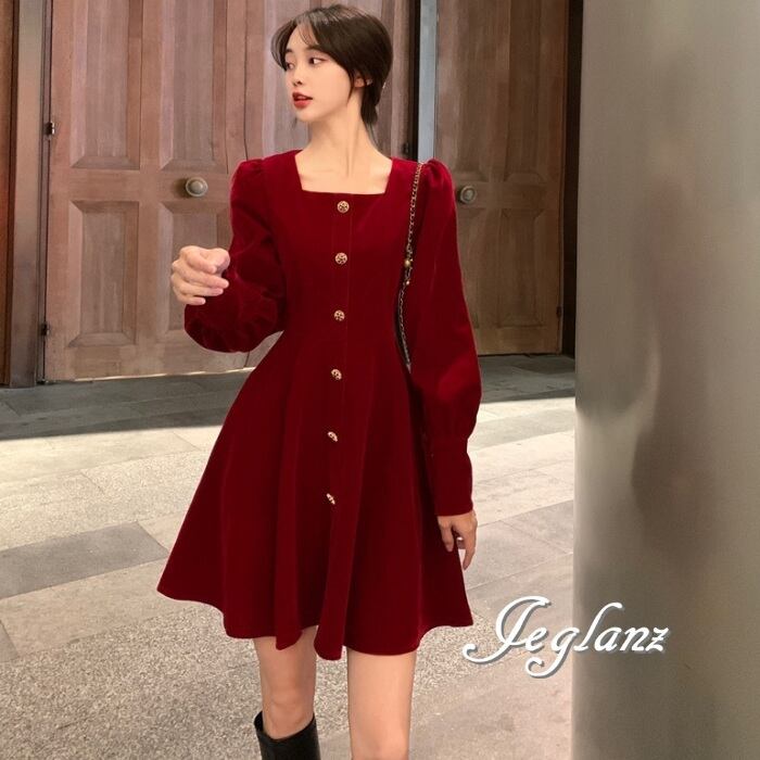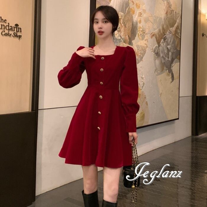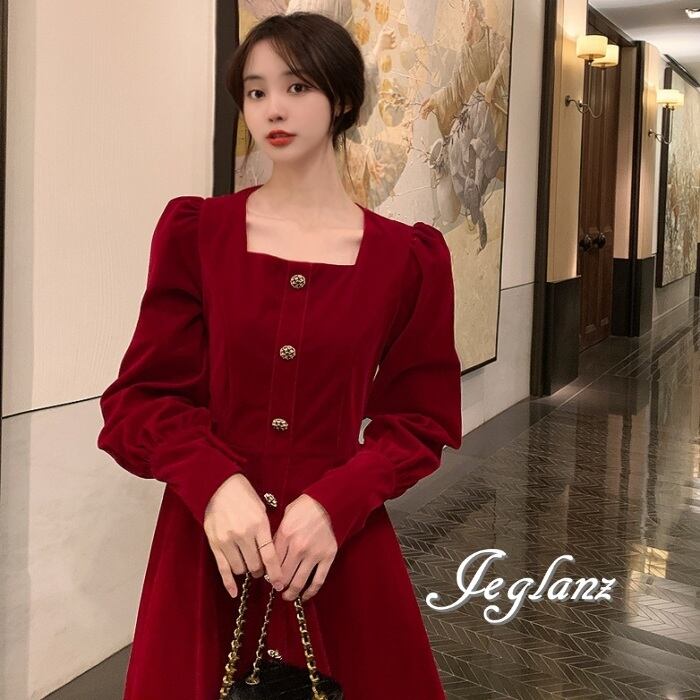 2色 ベルベット調 ワンピース ドレス ボタン クラシカル 光沢感(MB046)π