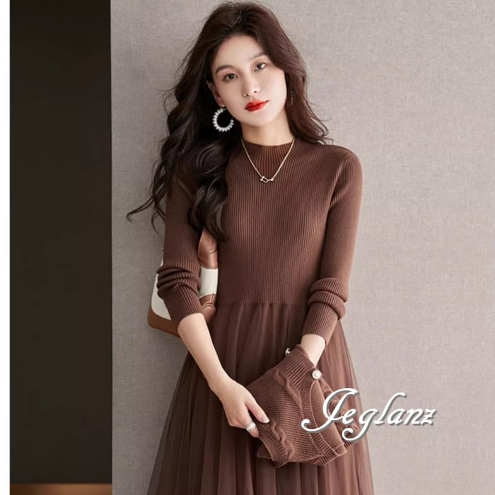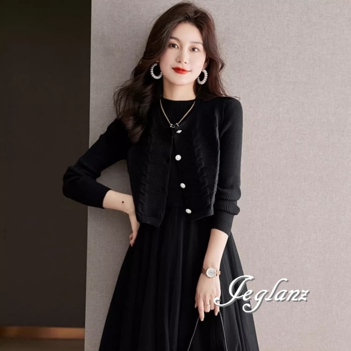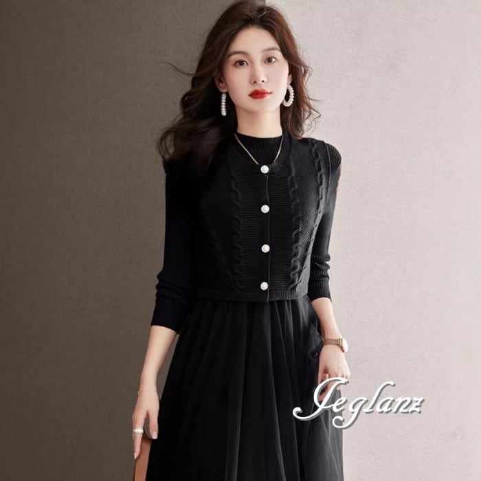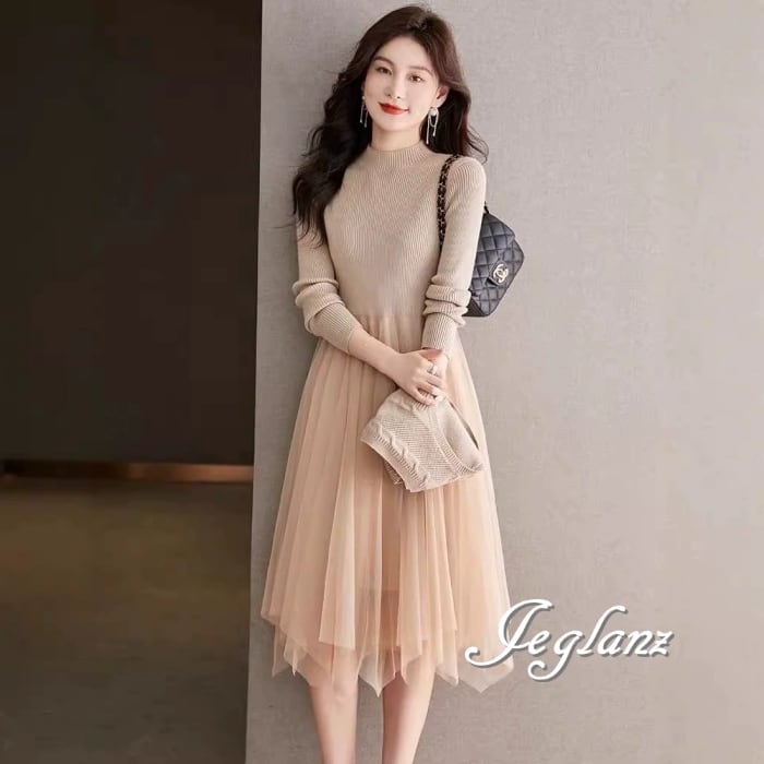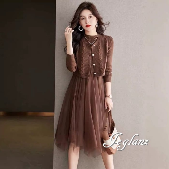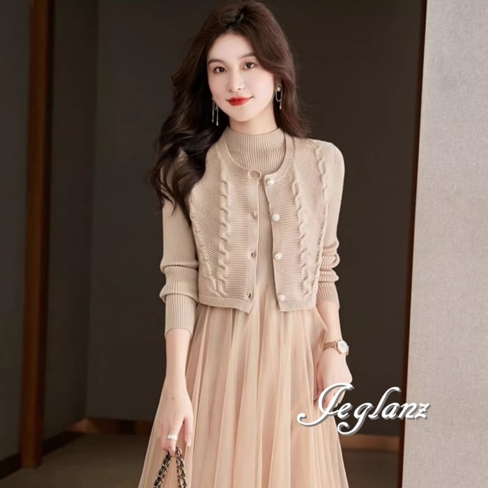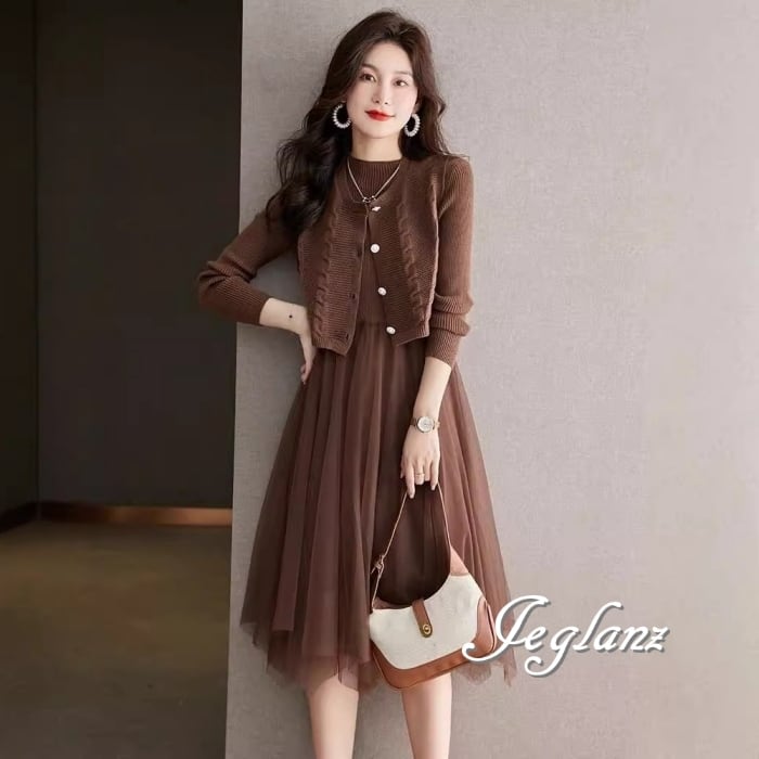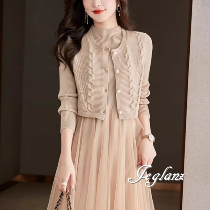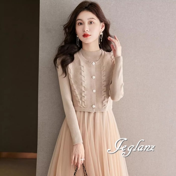 セットアップ 2点 ニット ジレ ベスト 長袖 チュール ワンピース 3色(MB065)ι