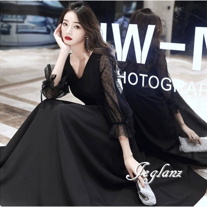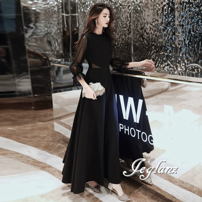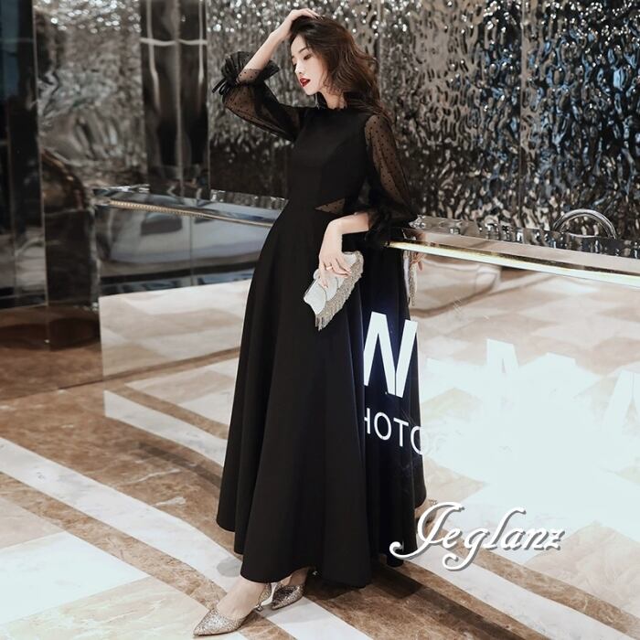 イブニングドレス カットアウト ブラックドレス シアー 異素材 レース 水玉(MB074)ζ