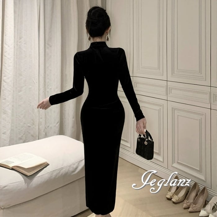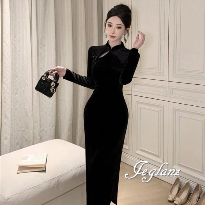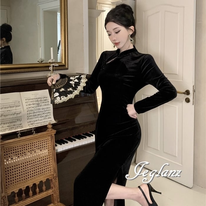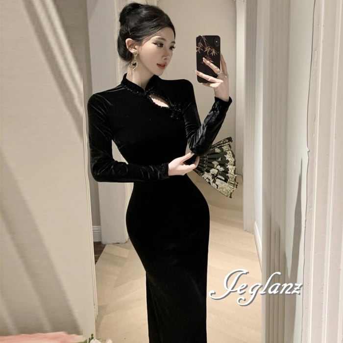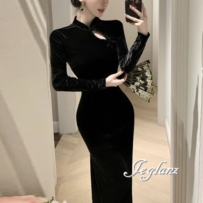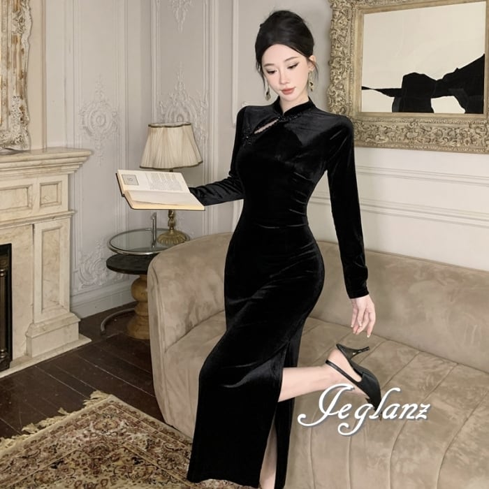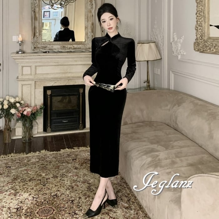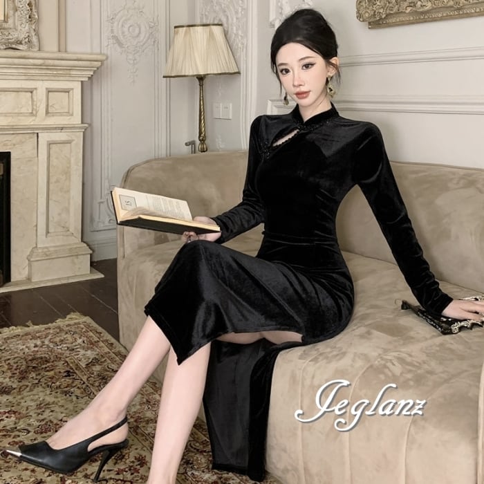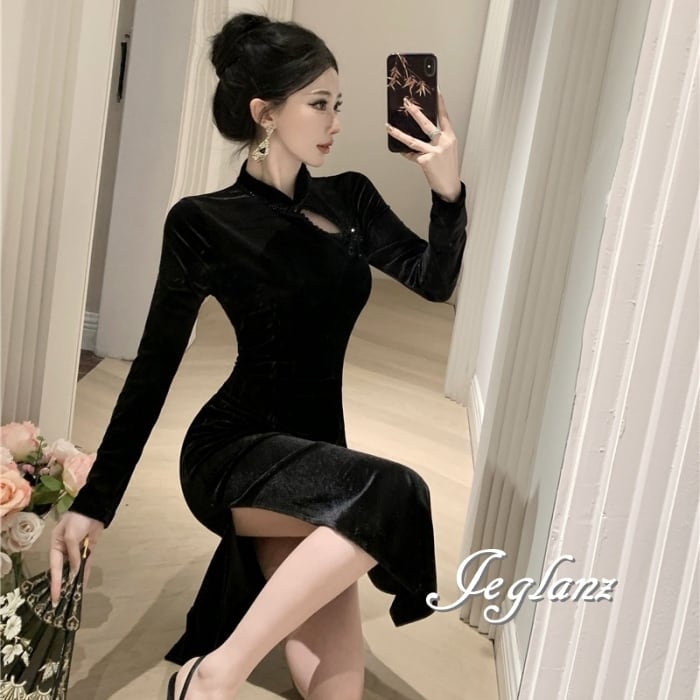 ベルベット調の光沢が美しいチャイナカラーのワンピース